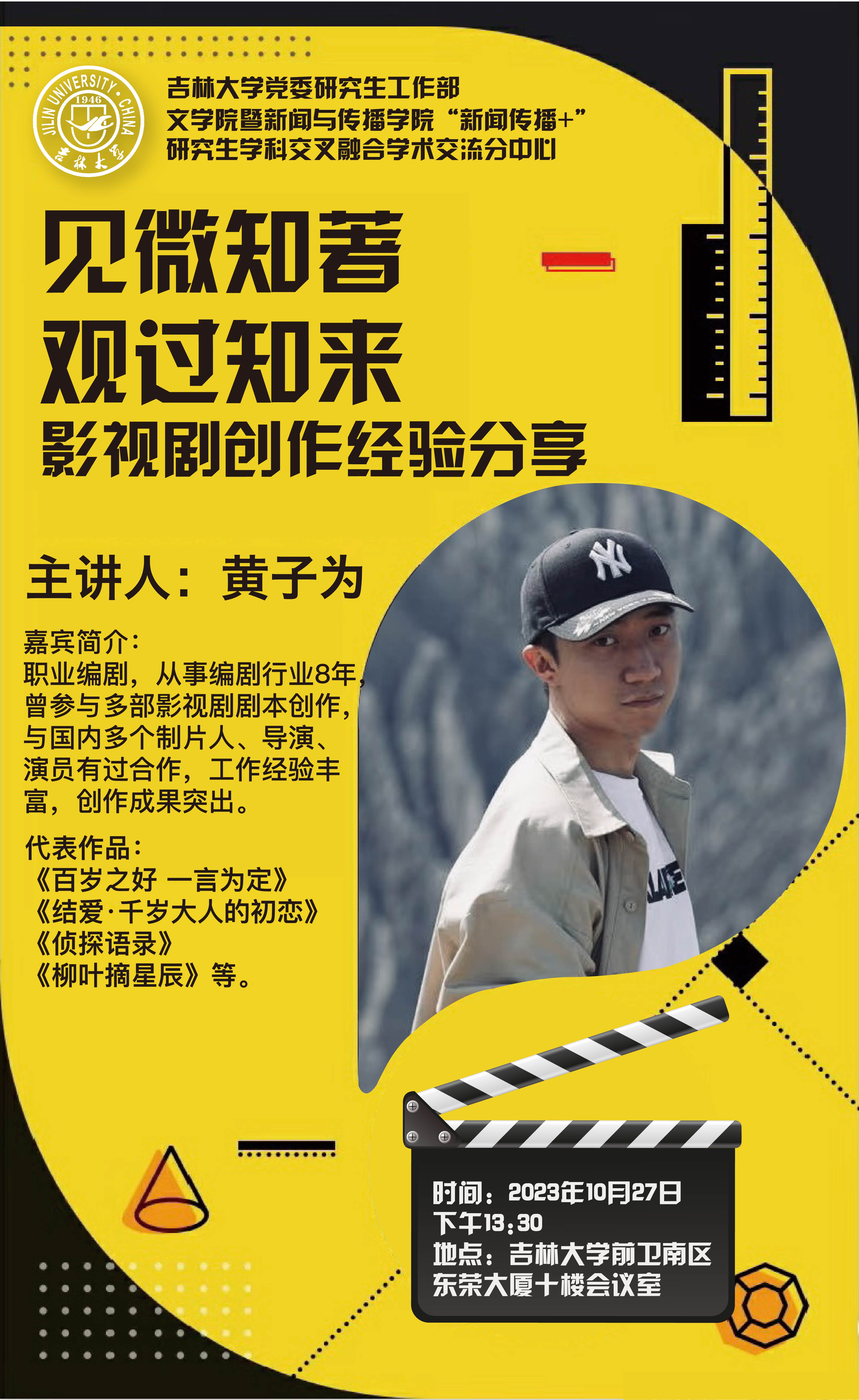 为了加强学生对影视行业工作的理解,深入了解互联网时代影视剧本创作的现状和发展趋势,探寻影视行业剧本创作理念,提升专业素养,提高创新思维能力,中心特邀青年编剧黄子为,分享其多年创作经验与体会。具体事项通知如下: