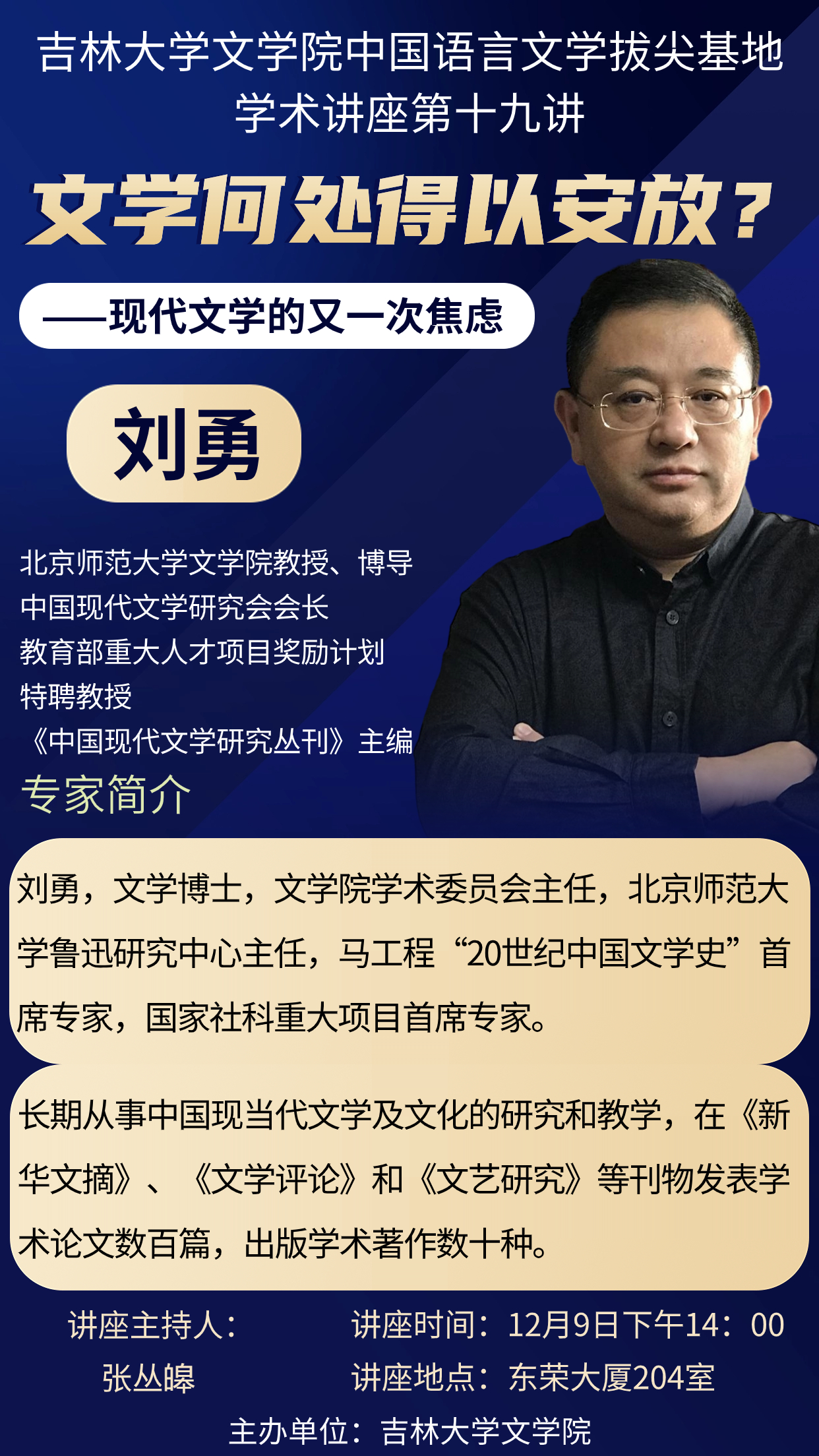 刘勇,文学博士,中国现代文学研究会会长,教育部重大人才项目奖励计划特聘教授,《中国现代文学研究丛刊》主编,北京师范大学极速飞艇