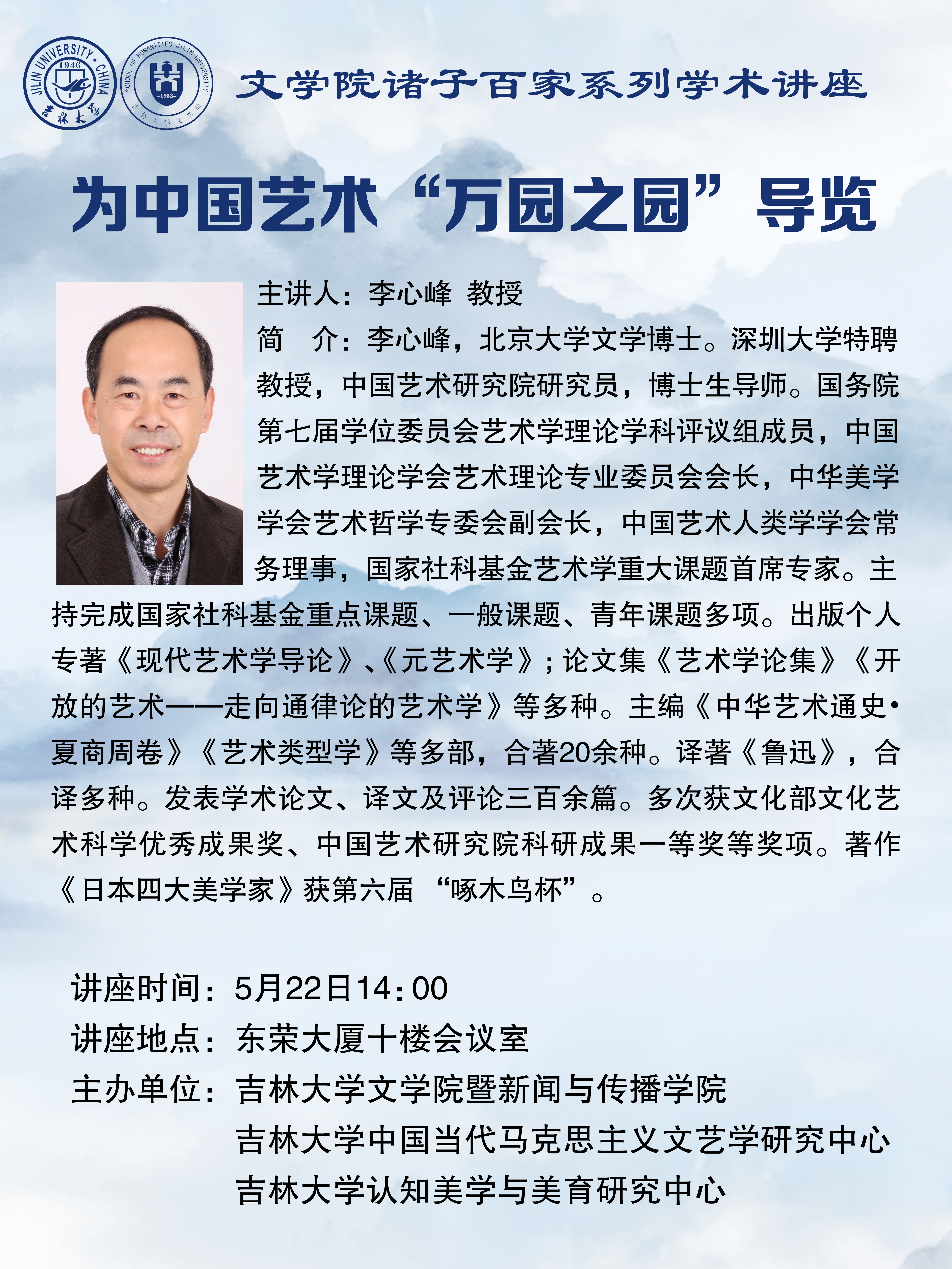 主讲人简介:李心峰,北京大学文学博士。深圳大学特聘教授,中国艺术研究院研究员,博士生导师。国务院第七届学位委员会艺术学理论学科评议组成员,中国艺术学理论学会艺术理论专业委员会会长,中华美学学会艺术哲学专委会副会长,中国艺术人类学学会常务理事,国家社科基金艺术学重大课题首席专家。主持完成国家社科基金重点课题、一般课题、青年课题多项。出版个人专著《现代艺术学导论》、《元艺术学》;论文集《艺术学论集》《开放的艺术——走向通律论的艺术学》等多种。主编《中华艺术通史•夏商周卷》《艺术类型学》等多部,合著20余种。译著《鲁迅》,合译多种。发表学术论文、译文及评论三百余篇。多次获文化部文化艺术科学优秀成果奖、中国艺术研究院科研成果一等奖等奖项。著作《日本四大美学家》获第六届 “啄木鸟杯”。