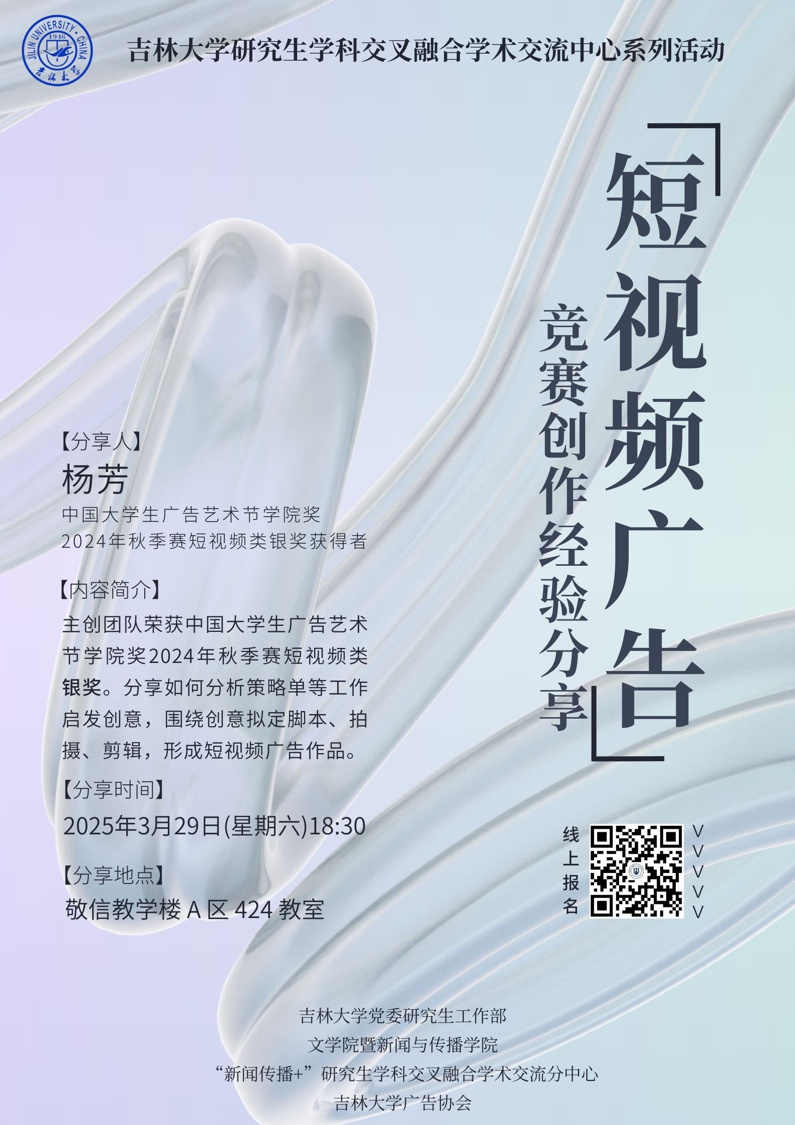 学生创意思维与专业能力素养,着力培养更多具有创新精神和实干本领的新时代复合型传媒人才。拟于近期开展短视频广告竞赛作品创作经验分享会,具体通知内容如下:
