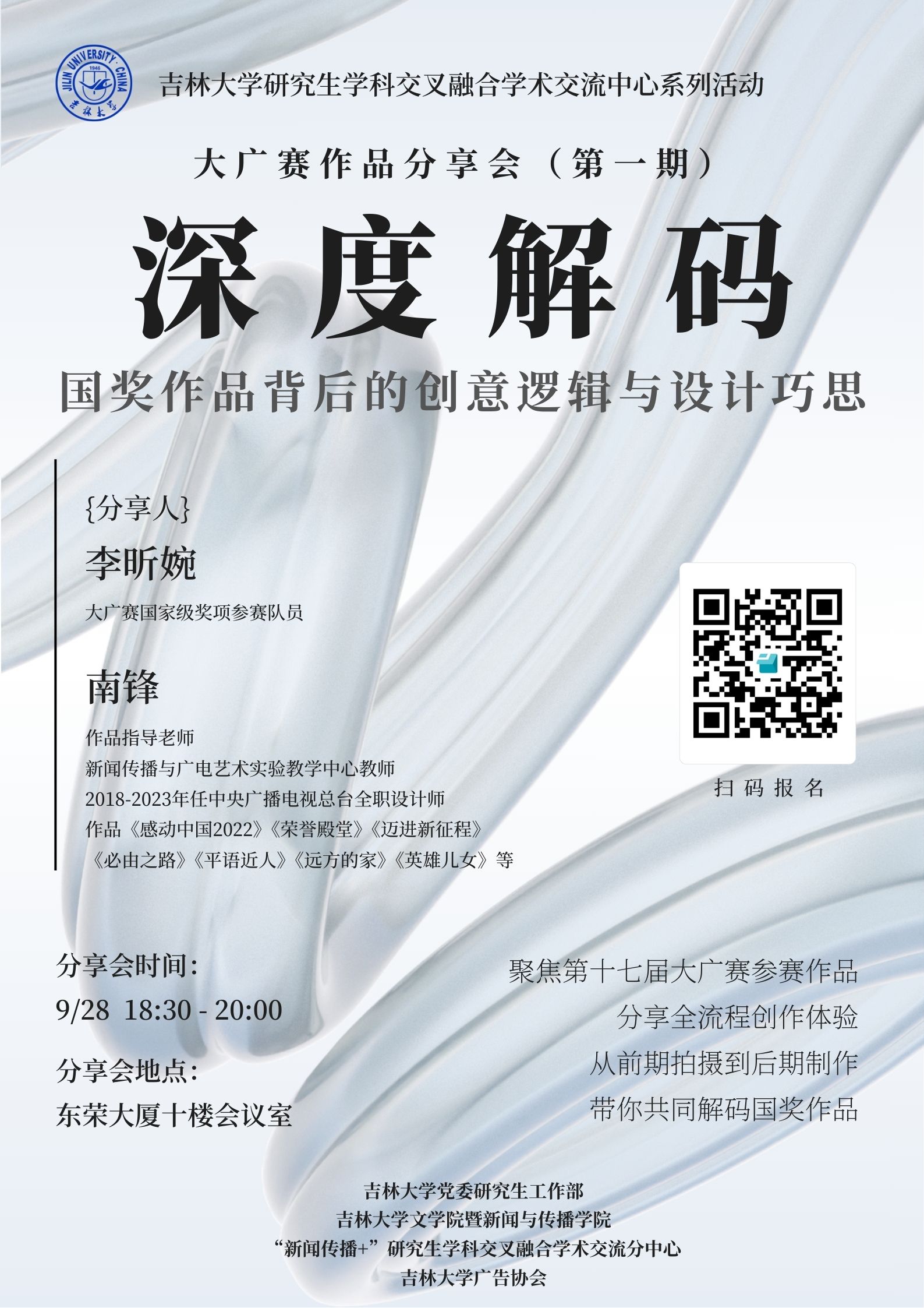 分享会简介: 本次分享会将聚焦第十七届大广赛参赛作品,围绕国奖作品的核心创意逻辑与设计巧思展开。获奖同学将结合自身参赛经历,从前期拍摄筹备到后期制作优化,全流程分享国奖作品的创作路径;通过剖析经典获奖案例,直观呈现优秀作品的设计亮点与创作技巧,帮助同学们明晰赛事创作方向,避免常见误区,积累实战经验,提升作品质量与参赛优势。