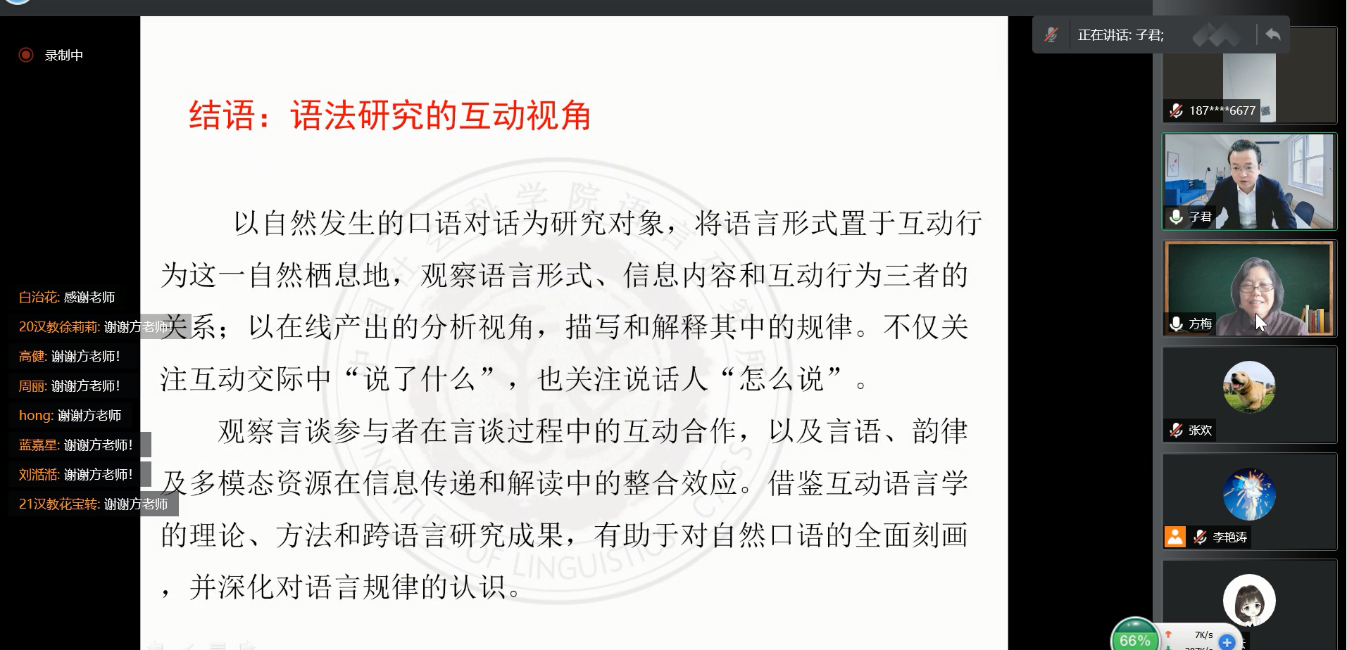 语言研究所研究员、教授、博士生导师,《中国语文》副主编、中国语言学会副会长方梅教授于腾讯会议线上为极速飞艇