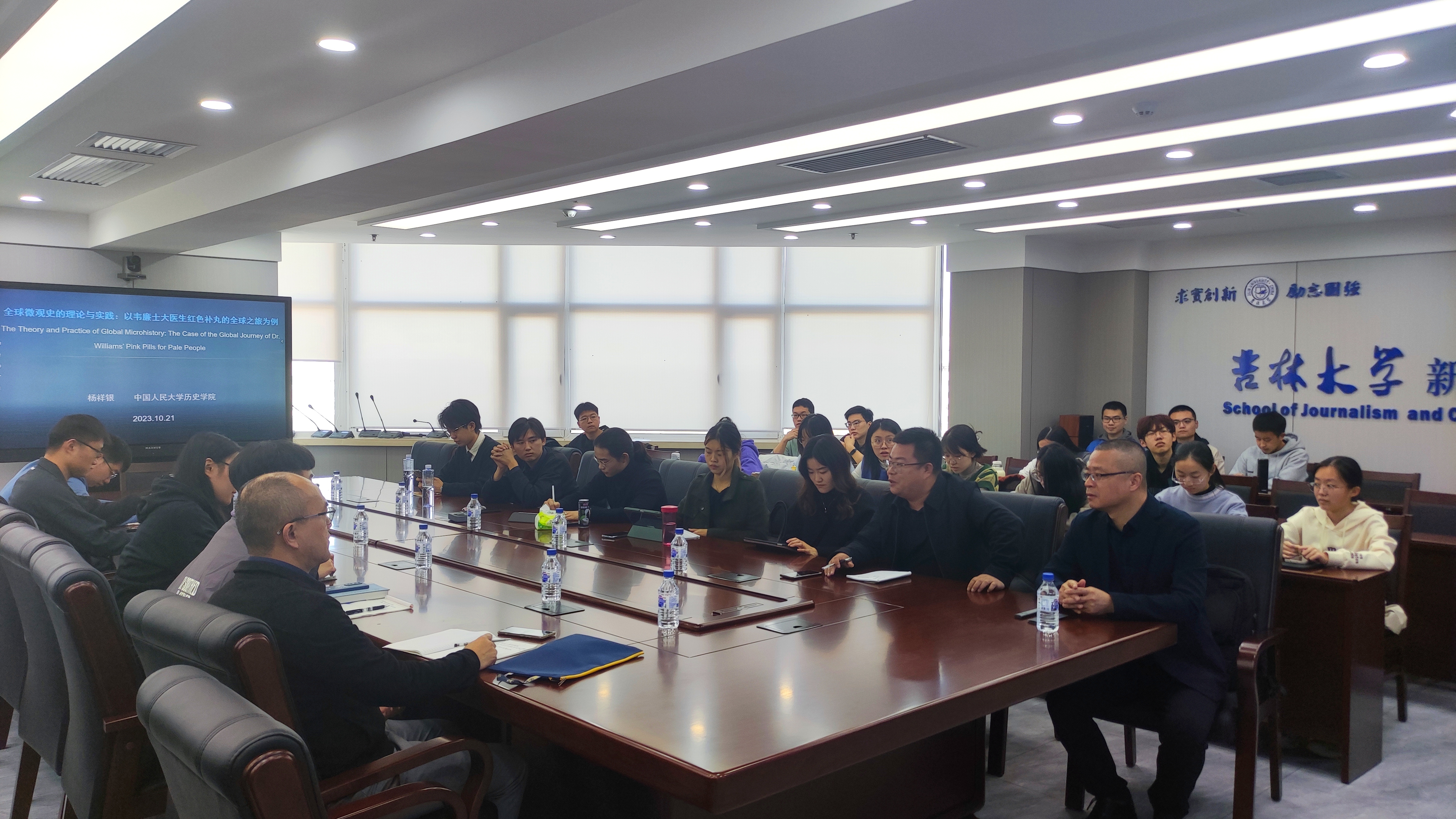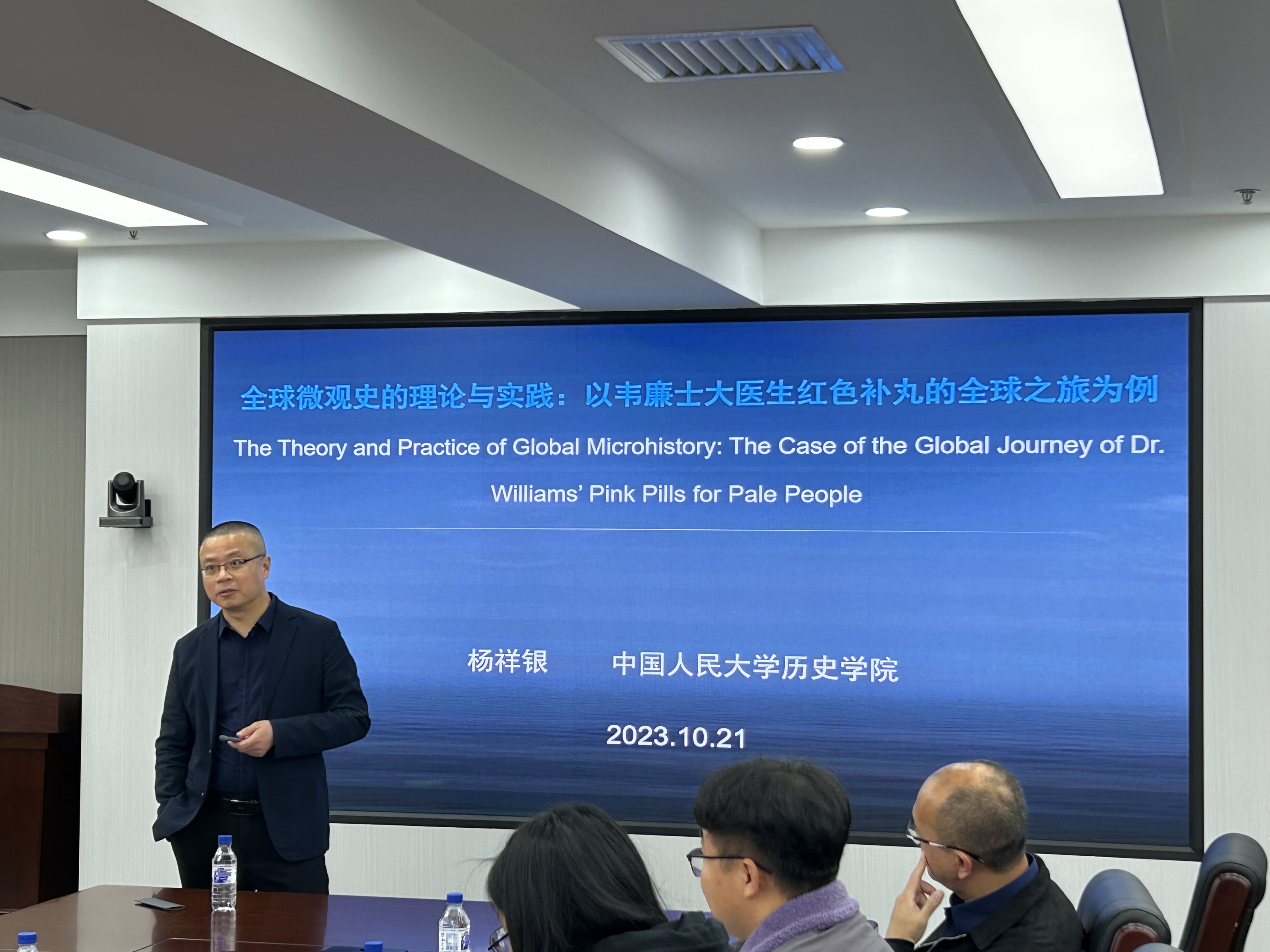 教授杨祥银老师进行了题为“全球微观史的理论与实践:以韦廉士大医生红色补丸的全球之旅为例”的学术讲座,中国史系副主任贾小壮老师主持讲座,系主任蒋金玲老师,以及徐萍、王万志老师参加会议。