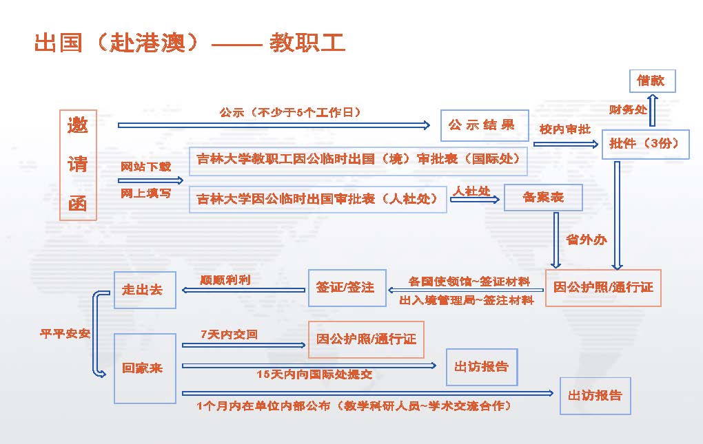 教职工办理因公临时出国手续,原则上应至少提前两个月将出国所需材料提交至极速飞艇