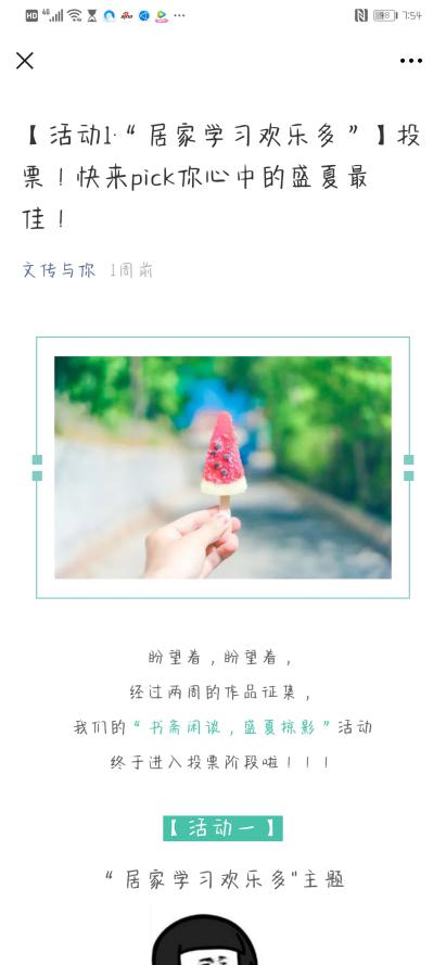 抖音账号上面,最后结合点赞数、投票数与老师评分进行评选。最终决出“盛夏掠影”活动的一二三等奖并颁发优质证书与二十小时的志愿时长。本次活动极大地激发了同学们的创作热情,在积极踊跃的参与氛围中,参赛同学通过短视频拍摄和趣味学习视频创作,创造了居家学习与自主学习的新动力,再次发现与重温家庭的欢乐与温情,挖掘并记录生活中的点滴美好。