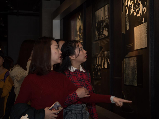 展馆内最醒目的大字“勿忘9·18”,以及抗战歌曲《松花江上》似乎都让同学们感受到了当时人们对家乡亲人的呼唤和早日收复失地的强烈渴望;走进毒气实验室,想象到当年惨绝人寰的毒气实验,和被当做试验品的千万同胞,大家都神情紧绷;展馆内模拟屠杀的场景仿佛正在发生;而历史会永远记住的1945年8月15日则让大家长舒一口气,经历了百年屈辱后,中华民族终于以胜利者的姿态站起来了。