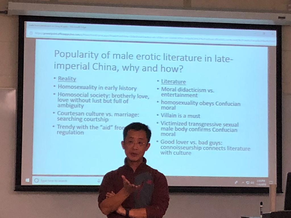图03:肯大何老师(Jianjun He)在讲课《从李渔到程蕙英:中国帝国晚期断袖文学探讨》。