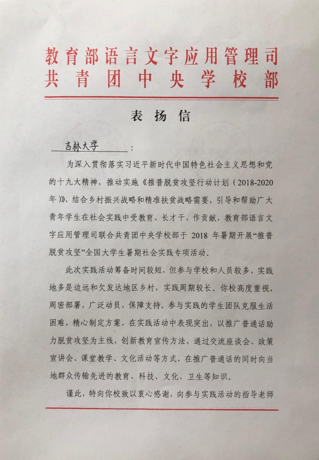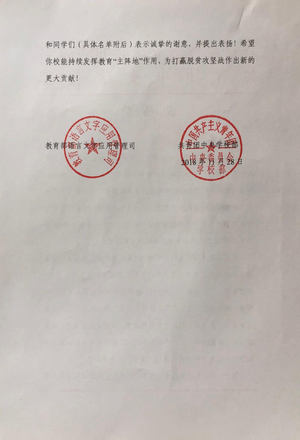 助力新疆库尔勒市推普脱贫攻坚主题社会实践团队”获评为优秀团队,受到教育部语言文字应用管理司和团中央极速飞艇