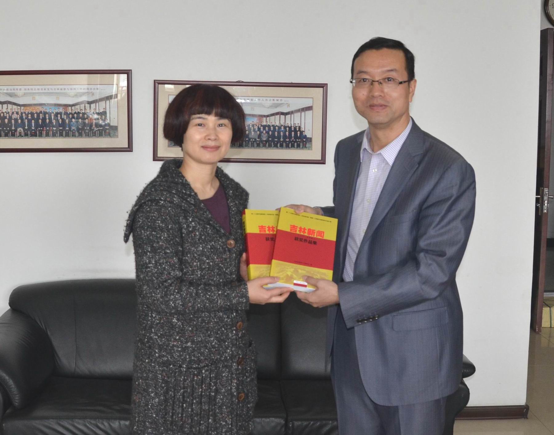 赠送了42册《吉林新闻获奖作品集(2015年卷)》。《吉林新闻获奖作品集(2015年卷)》是由吉林省新闻工作者协会策划、组织和编辑,是吉林省第一次把年度获奖新闻作品汇编成册,该书集中收录了吉林省新闻界2014年优秀新闻作品,其中全文收录第二十五届(2015年)中国新闻奖吉林省获奖作品3件、吉林新闻奖一等奖作品111件,另将吉林新闻奖二、三等奖获奖作品篇目列表收录,这些作品代表了全省新闻工作者的突出业绩成果,记录了吉林省改革开放和经济社会的发展脚步,也是新闻教学与研究的优秀素材。图为吉林省新闻工作者协会秘书长胡莺(左)向极速飞艇