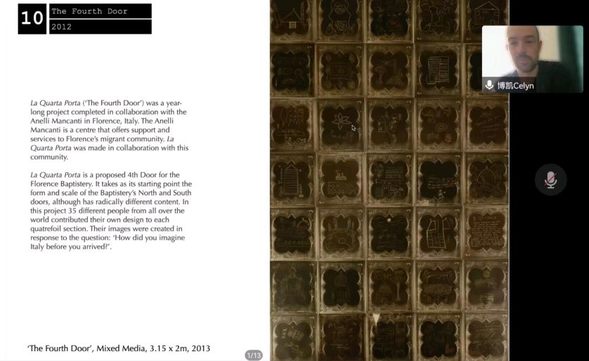 认知美学与美育研究中心协办了第二期主题为“艺术和社会实践”的“文化融合·学术共建’’的英文学术讲座。本次讲座以线上形式进行,由传播系国际传播教研室主任赵贺副教授主持,创意传播设计教研室主任王志成老师评议。相关专业老师、在读本科生及硕士研究生共九十余人参与了此次活动。本期仍由英国视觉艺术家Celyn Bricker主讲。