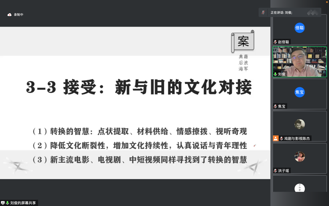 刘教授从传媒艺术创作、传播和接受三个新现象谈起,从短视频的逻辑重组、渗透式的推送扩散、新与旧的文化对接三个方面展开并进行深入剖析。讲座结束后,各专业同学积极与刘俊教授就讲座相关内容进行探讨。交流分享中,帮助与会同学深入了解传媒艺术的现状和发展趋势,促进了学科间的相互交流。