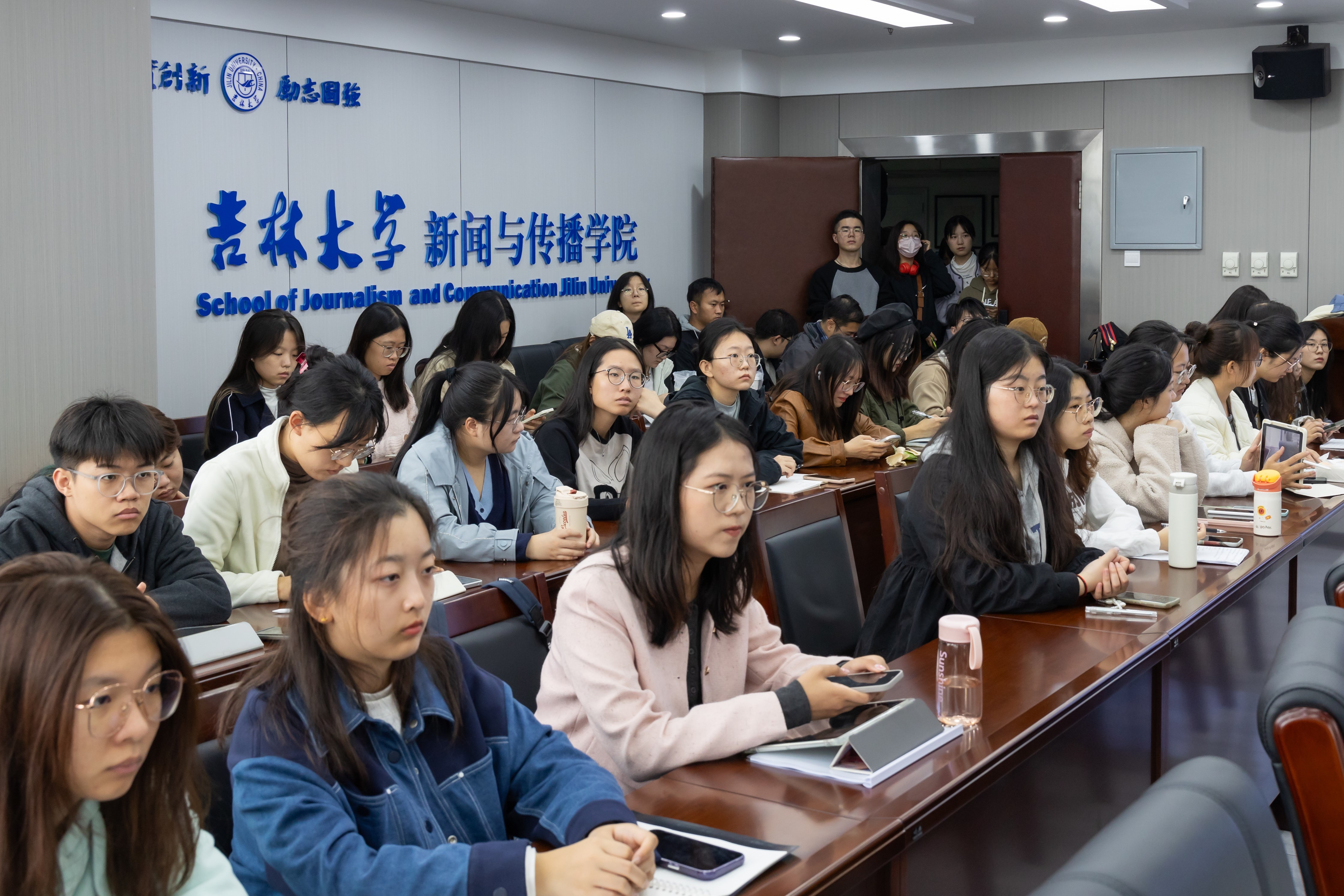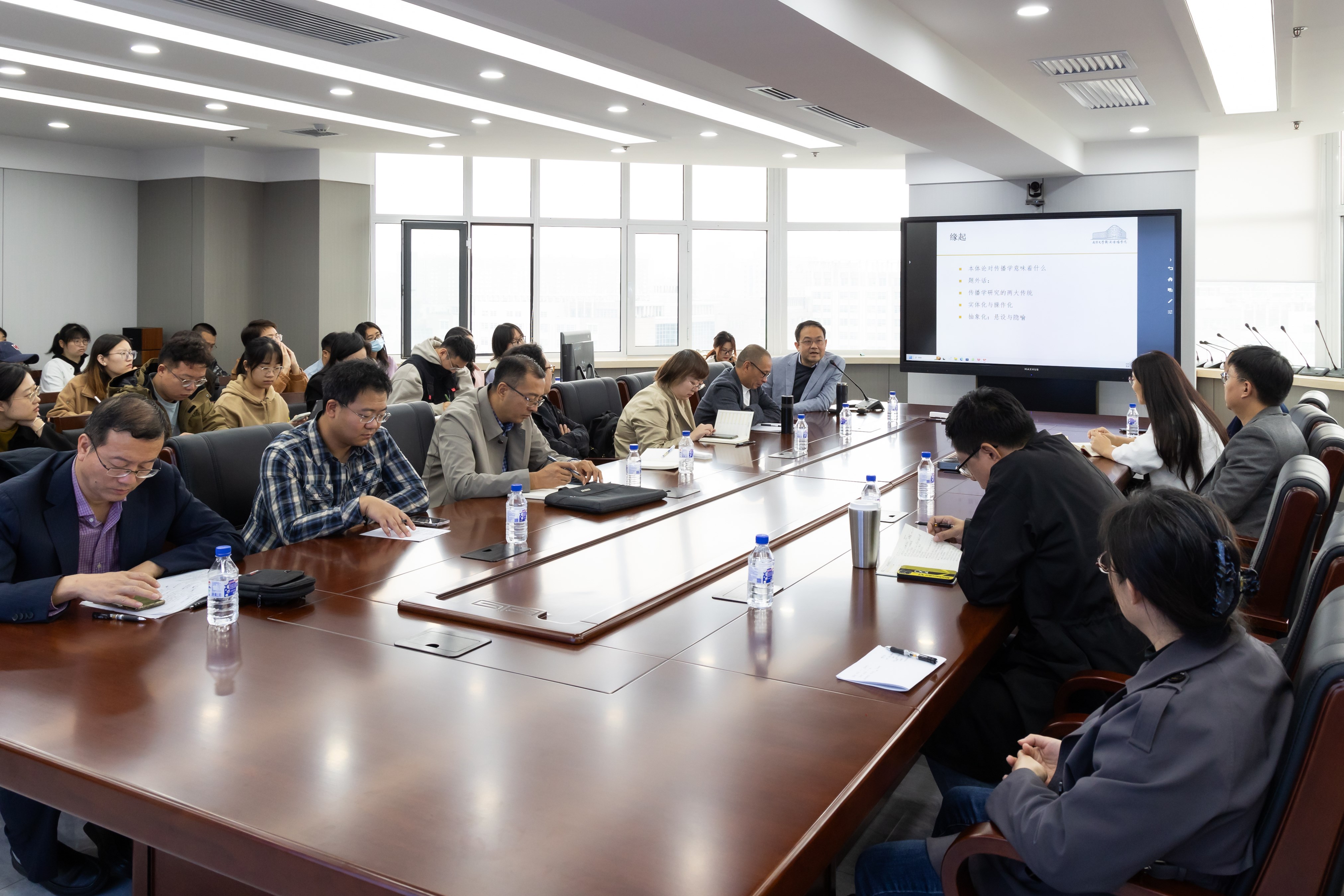 本次讲座线下参与人数超百人,师生参与度高,学术探讨深入。来自新闻传播学、文学、历史学、社会学、哲学等学科的同学积极参与本次讲座。会议室在讲座开始前半小时就已座无虚席,冒雨赶来的同学们或坐在加设的座椅上,或站在门口聆听讲座。近三小时的讲座结束后,许多同学仍不愿离去,各专业同学留在会议室讨论讲座内容,相互交流思考与感受。并有同学在讲座结束后自备胡翼青教授的论著敬请教授签名留念。