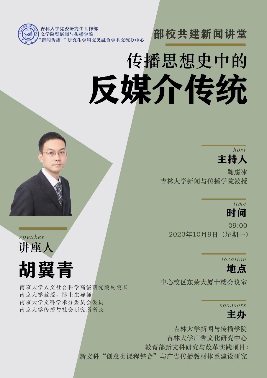 、“新闻传播+”研究生学科交叉融合学术交流分中心成功举办了以《传播思想史中的反媒介传统》为题的学术讲座。本次讲座特邀南京大学人文社会科学高级研究院副院长、南京大学教授、博士生导师、南京大学文科学术分委员会会员、南京大学传播与社会研究所所长胡翼青教授作为主讲人。讲座由极速飞艇