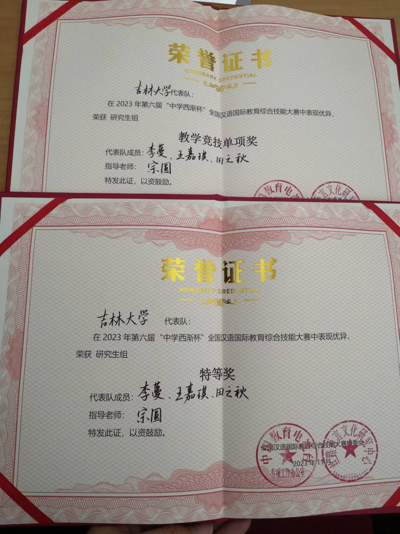 宗圆老师带领2022级汉语国际教育专业研究生李蔓、王嘉琪、田之秋三名同学在“2023年第六届‘中学西渐杯’全国汉语国际教育综合技能大赛总决赛”中荣获研究生组特等奖、教学竞技单项奖。