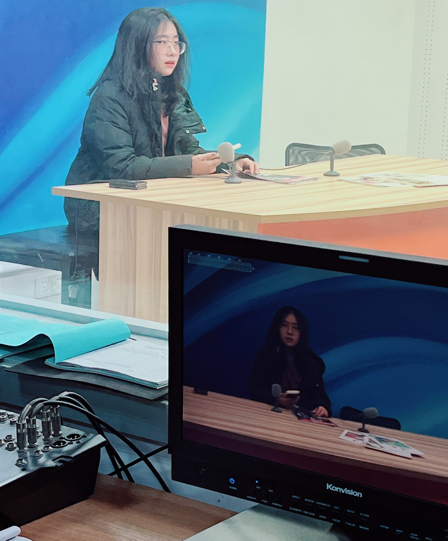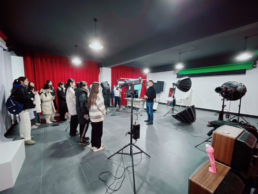 首先参观的是摄影室,陈新阳老师作为主讲人向大家展示了背景布,顶棚灯光,柔光箱等专业设备名称及使用方法,及其专业的场景设置大大激发了同学们的参观与学习热情。随后,陈老师带领大家来到播音室,同学们见识到了控制台,音频台,提词器,棚内麦克等专业设备,并进行了仔细的观察与实践。