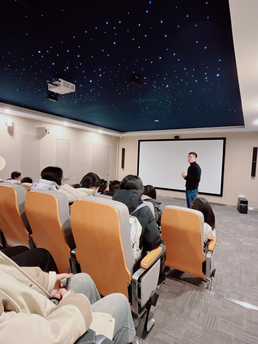 最后参观的是虚拟演播实验室,在这里大家了解到了它可以模拟录制环境,有虚拟背景和自动抠图功能。在讲解过程中,陈新阳老师也对新闻与传播相关行业的发展状况进行了一些独到的分析并提出建议。在活动的最后,老师鼓励同学们充分发挥自己的想象力,积极利用好现有资源创造出最大价值。