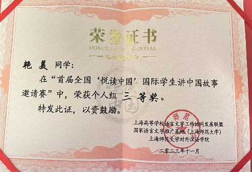 另一位入围复赛的学生艳美(泰国),以其活泼灵动的表现力感染了在场的每一个人,荣获三等奖。领队教师董美含,荣获优秀指导教师。