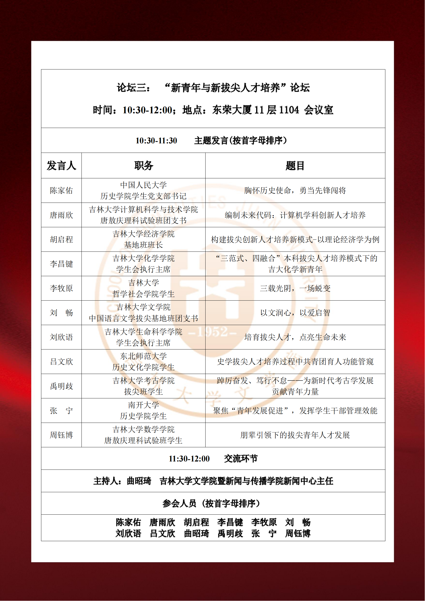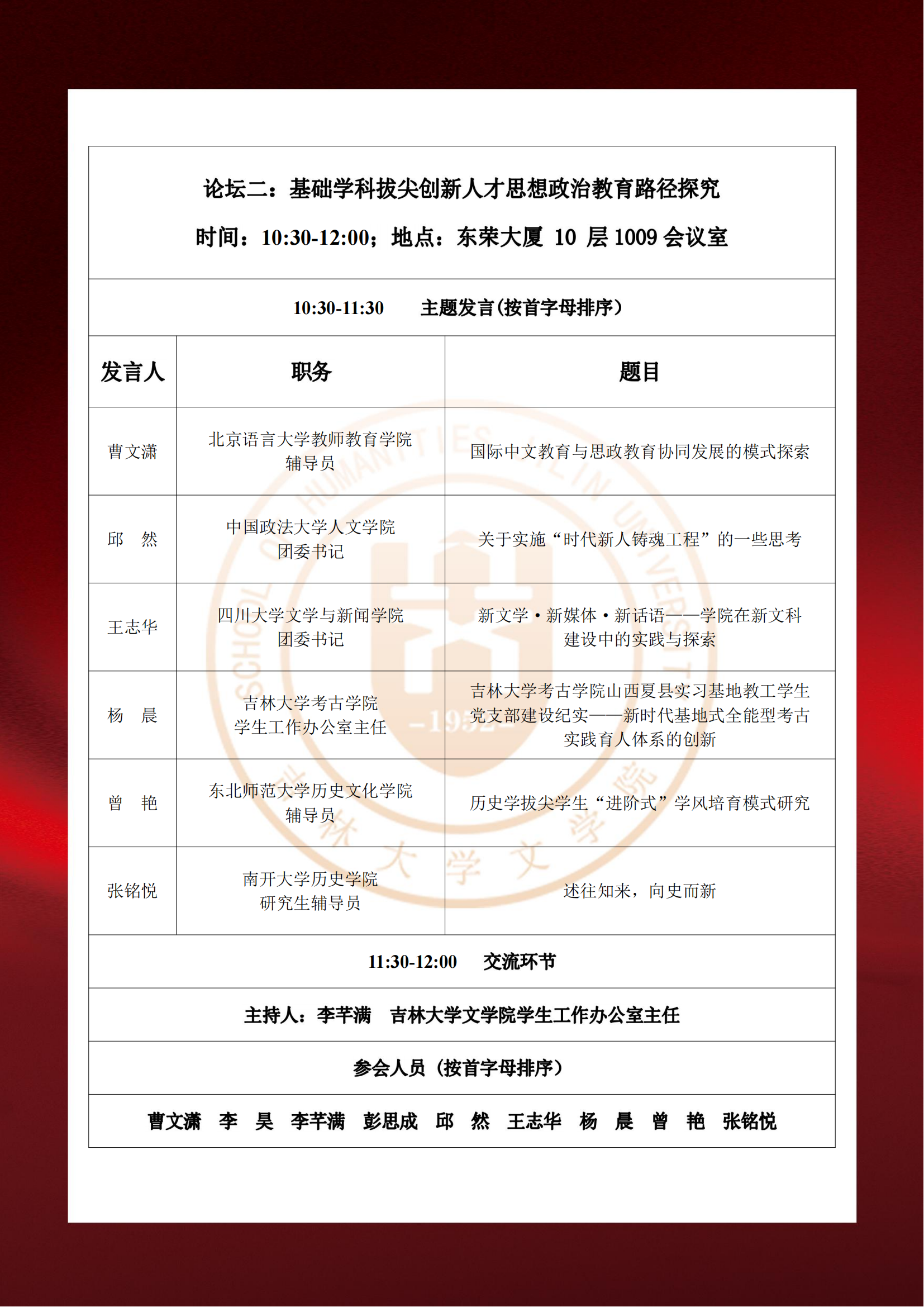 本次联学论坛围绕“党建引领拔尖人才培养”“基础学科拔尖创新人才思想政治教育路径探究”“新青年与新拔尖人才培养”等主题设有三个分论坛。