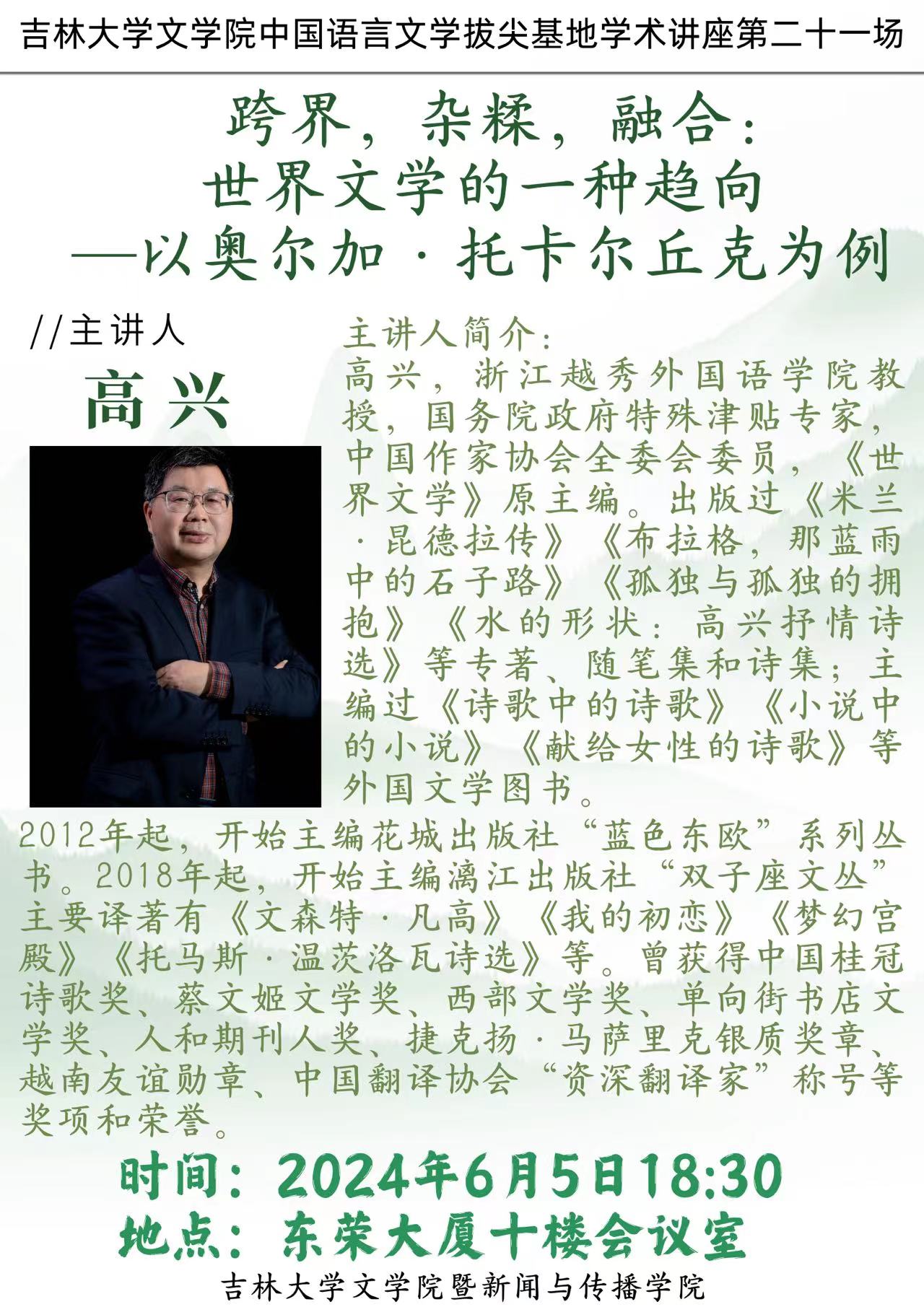 宣布将2018年诺贝尔文学奖授予波兰女作家奥尔加·托卡尔丘克。诺贝尔文学奖犹如一道聚光灯,让托卡尔丘克几乎在一夜之间为世界所瞩目。高兴教授在讲座中结合波兰历史和文学史,介绍了波兰历史上获得诺贝尔文学奖的五位作家显克维奇、莱蒙特、米沃什、希姆博尔斯卡、托卡尔丘克。继而以托卡尔丘克中心,通过对托卡尔丘克作品文本的细读、鉴赏、解析,分析了托卡尔丘克的文学观念和写作意图,引导在场师生走进托卡尔丘克的文学世界。高兴教授认为,托卡尔丘克的创作在相当程度上反映出了二十一世纪世界文学的一种趋向,这就是跨界,杂糅,和融合。