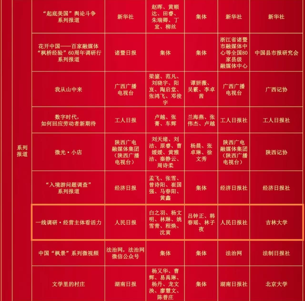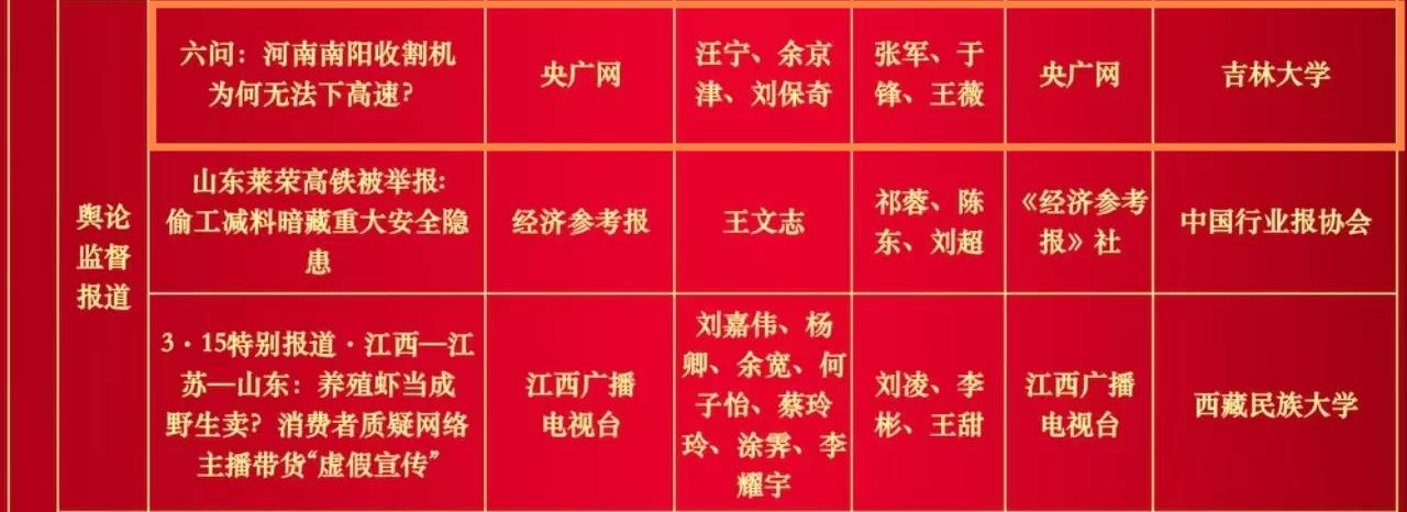 报送的2件作品:央广网的舆论监督报道《六问:河南南阳收割机为何无法下高速?》(作者:汪宁、余京津、刘保奇,编辑:张军、于锋、王薇)、人民日报的系列报道《一线调研·经营主体看活力》(作者:白之羽、杨文明、林琳、姚雪青、程焕、沈寅,编辑:吕钟正、韩春瑶、林子夜)双双获得第34届中国新闻奖二等奖。该院自2016年成为中国新闻奖试点报送单位以来,至今已有6件初评报送作品获得中国新闻奖。