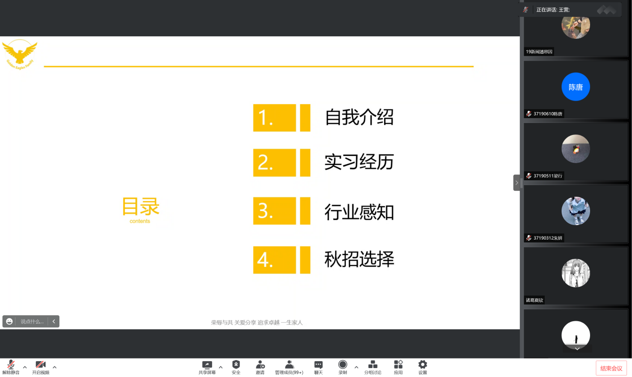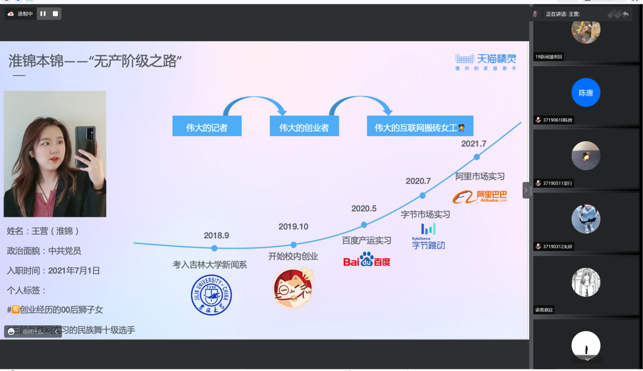 2019级辅导员于航老师主持,邀请到了三位荣获出彩就业创业人物奖项的2018级即将毕业的学子。优秀的学子们从自身经历出发,为同学们在就业与创业方面带来了许多经验和建议分享。