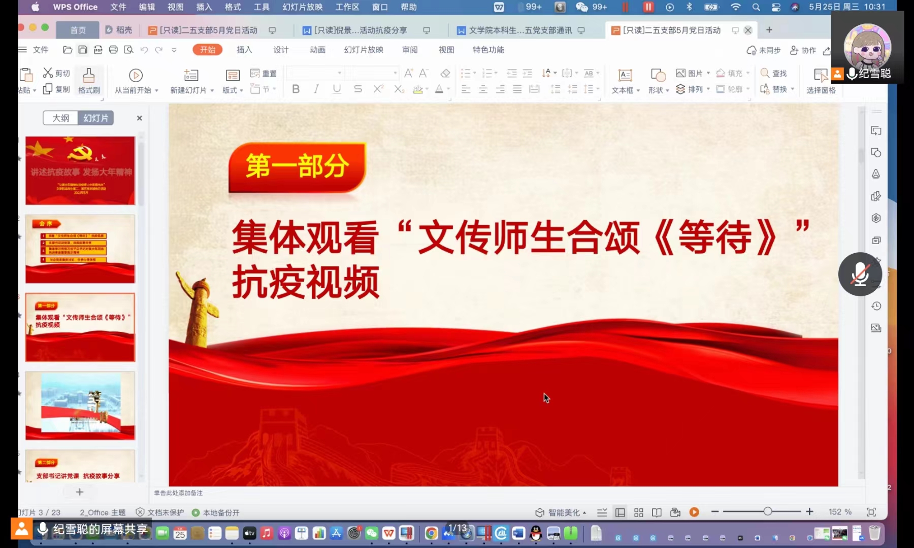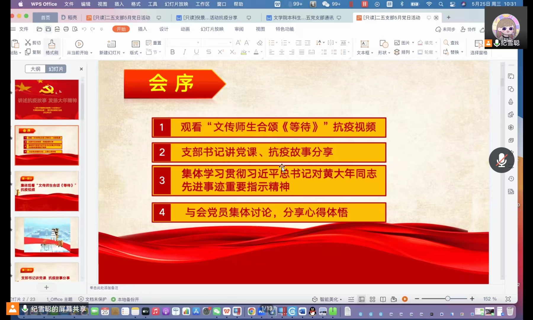 本科生第二、第五党支部于2022年5月25日上午10:30在腾讯会议开展“讲述抗疫故事,发扬大年精神”主题党日活动。会议由第二党支部书记曲昭琦和第五党支部书记王振彰组织召开,支部全体党员、2022年第一期新闻与传播极速飞艇