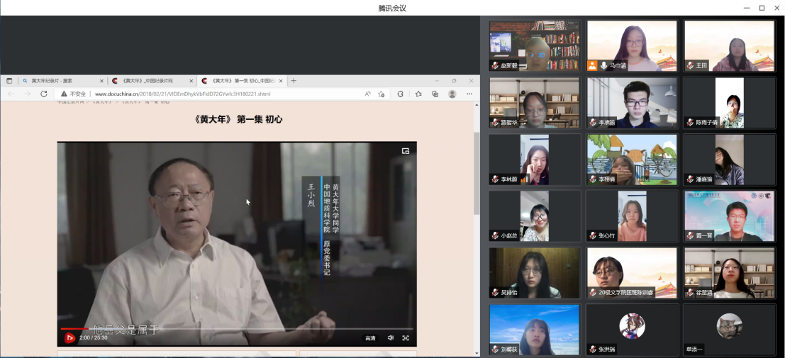 汉语言文学专业2020级团支部6月5日18时30分于腾讯会议线上开展“学习黄大年精神”主题团日活动。同学们一起观看了《归去来兮——黄大年》微电影,共同学习黄大年同志的先进事迹。黄大年不计个人名利,只想把自己掌握的国际最前沿科技成果全部奉献给祖国的精神深深感动了同学们。