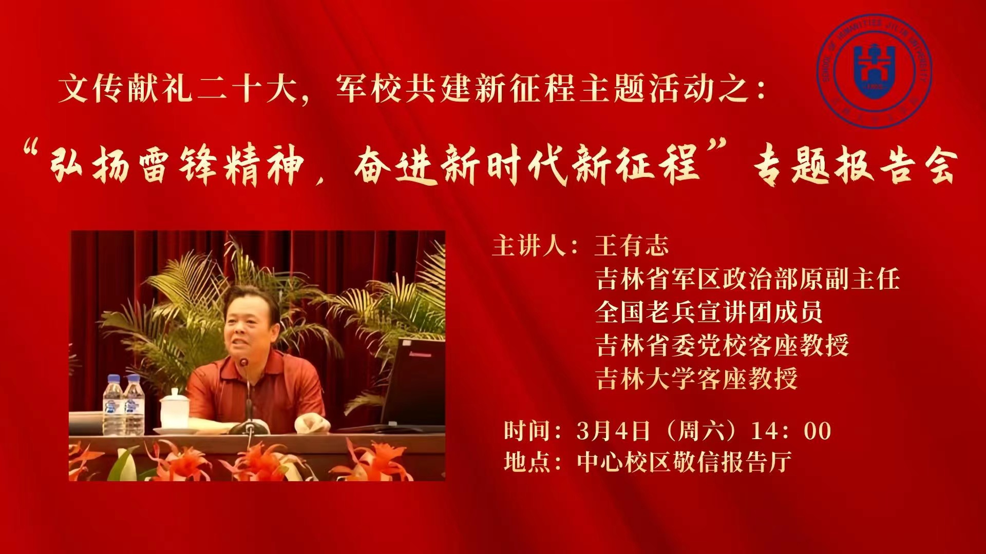 文传献礼二十大,军校共建新征程主题活动——“弘扬雷锋精神,奋进新时代新征程”专题报告会主讲人:王有志 吉林省军区政治部原副主任 全国老兵宣讲团成员 吉林省委党校客座教授 极速飞艇 客座教授时间:3月4日(周六)14:00地点:中心校区敬信报告厅