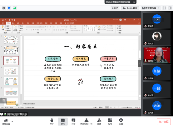 接下来是10位同学分享经验的环节。宋其芳同学讲述了她的实践过程,并分享了心得体会;周思岐同学提出“实践要以内容为主”的建议并强调队内协调、时间安排的重要性;朴东赫同学着重在细节上提出了一些实用小建议,并强调实习与实践的重要性;马云竹同学结合自己的社会实践实例讲解了调研报告的做法及注意事项;翟悦妍同学详细讲解了“返家乡”社会实践活动的参与方式;赵天源同学、黄一晋同学、石欢然同学、黄宝申同学、徐琳博同学也都依次对自己的社会实践项目进行了介绍并分享自己的心得。2022级同学们积极讨论,提出疑问,10位同学也做出了详细的解答。