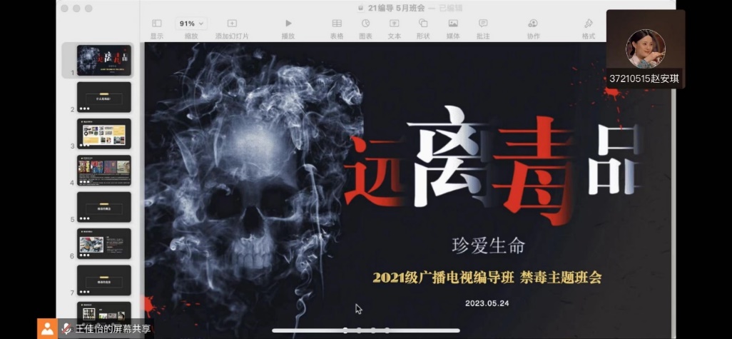 广播电视编导班级在班主任王佳怡的组织下,于腾讯会议开展了以禁毒宣传教育为主题的线上班会。作为生活在象牙塔中的大学生,毒品离我们看似很遥远,实际上却始终在潜伏在身边的阴影中。会议伊始,王佳怡老师便点明了远离毒品的主题,并郑重地告诉大家,无论何时何地,绝不能跨雷池一步。为了让我们更清晰地了解毒品有关知识,从而更好远离,老师从什么是毒品、吸毒的概念、吸毒的危害等方面多角度进行了讲解。同学们也在听完后纷纷表示,要对自己的人身健康和安全负责,不会触碰法律的红线。祖国的未来不应也不能被毒品侵害,愿我们都能坚守底线、行稳致远。