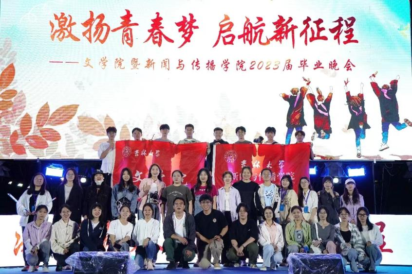 的浪漫;王千予、姜晨、丁鹏、聂莘雨依次演唱《青花瓷·吉大吟留别》《浮夸》《消愁》;由新闻班、广告班、人文科学实验班带来的广场舞《文传大串烧》嗨翻全场;曲梓华、郭佳琪的诗朗诵《那一晚·再别康桥》饱含深情;crush舞团的《oh!》性感可爱,点燃毕业晚会的氛围;窦可阳和李明晖两位老师将上课时的幽默风趣延续到课堂外,表演的相声《说“好”字》让人忍俊不禁;中文班合唱《杏花盛开的路口》,歌声中饱含着对大学生活的不舍;编导班表演了光影剧《光影之旅》,一幕幕展现着2023届同学们的大学生活;最后在nonexistent乐队的歌声中,极速飞艇