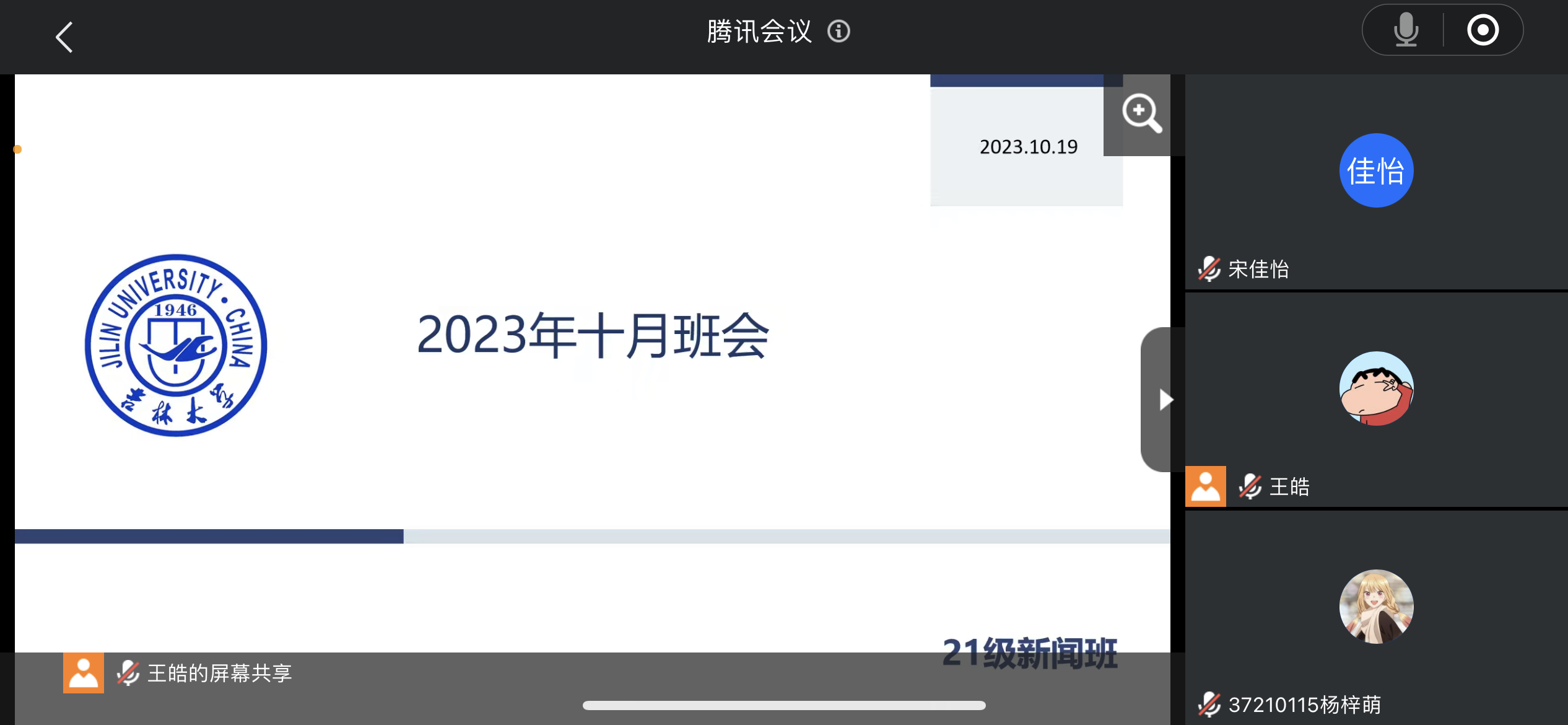 2023年10月19日,为解答同学们学习生活各方面的困惑,传达习近平总书记关于思想文化发展的最新指示,新闻系以线上腾讯会议的形式召开了10月班会活动。会议首个环节,班主任张斯琦老师对同学们新学期的学习状态表示关切,并给予了学业指导,鼓励同学们本学期在学习新闻实践相关课程时,要关注未来毕业事项,提前为考研或就业做好规划。其次,班长王皓带领同学们学习习近平主席新思想。新时代新征程,同学们作为新时代的年轻人,要承担起社会责任,应当积极支持和发展宣传思想工作,推陈出新,争取文化阵地的创新和突破。最后一个环节,张斯琦老师与同学们深入探讨和交流,解答了同学们关于学年论文、考研方向、学业成果展示等各方面的问题。老师也提醒大家不仅要重视学习,也要关注身体和心理健康,争取德智体美劳全面发展。