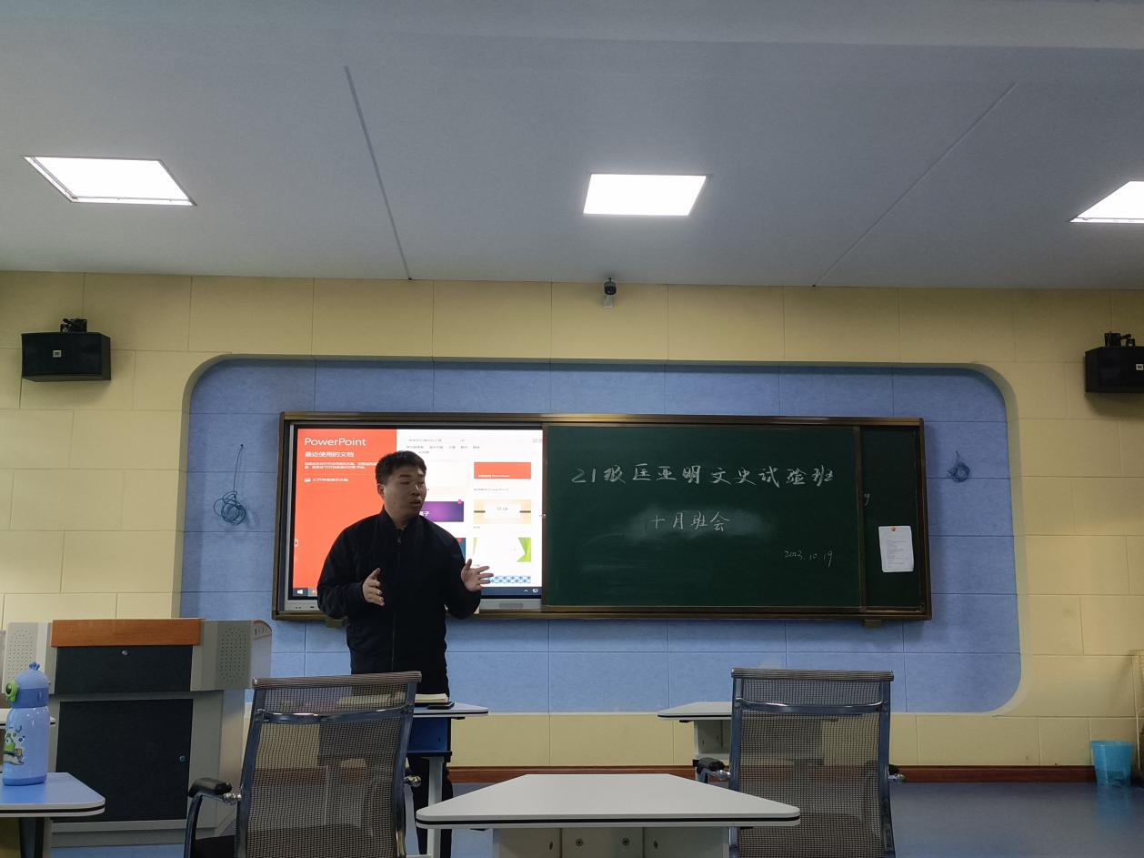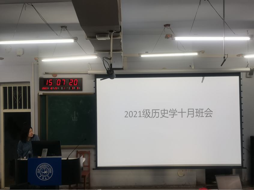 21级历史学专业于萃文楼第一阶梯教室开展10月主题班会,班会由班主任陶莎老师、班长袁仁斌同学主持。在班会上,陶莎老师首先向同学们简要了解同学们的学习和日常生活情况,解答了同学们关于论文写作的相关疑问,并分享了文献综述检索和写作的方法与技巧。随后杨佳欣老师面向本班同学们简要介绍了未来学业规划和职业规划的必要性和意义,提醒同学们对学业以及毕业去向做出相应的规划。最后陶莎老师引导同学们关注国家思想文化领域的各项方针政策,学习习近平新时代中国特色社会主义思想,树立坚定的理想信念。