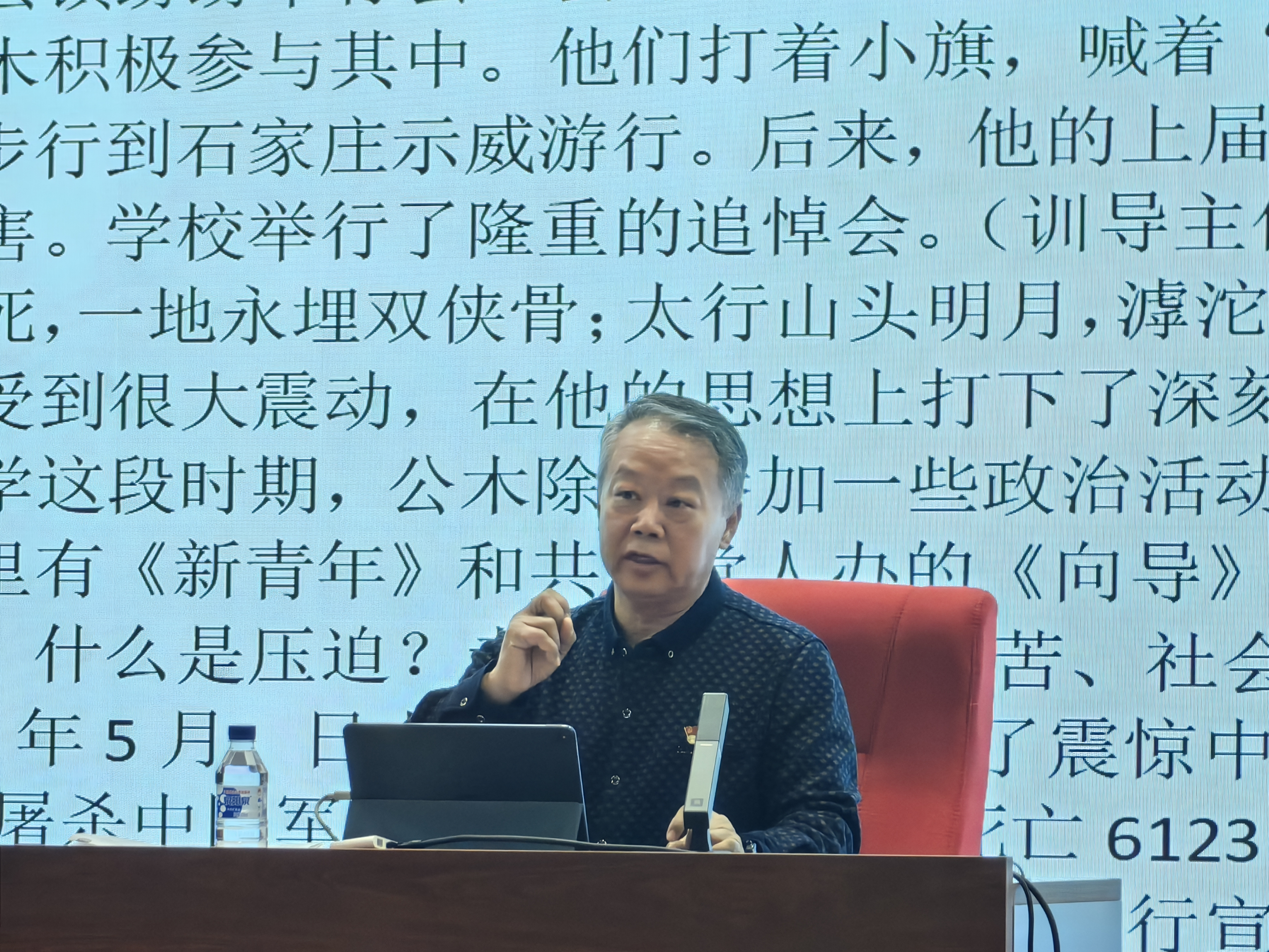 办公室张谦谦老师为王老师献花,表达对王老师精彩报告的敬意和对老一辈英雄传承的崇高敬意,全场师生致以最热烈的掌声。