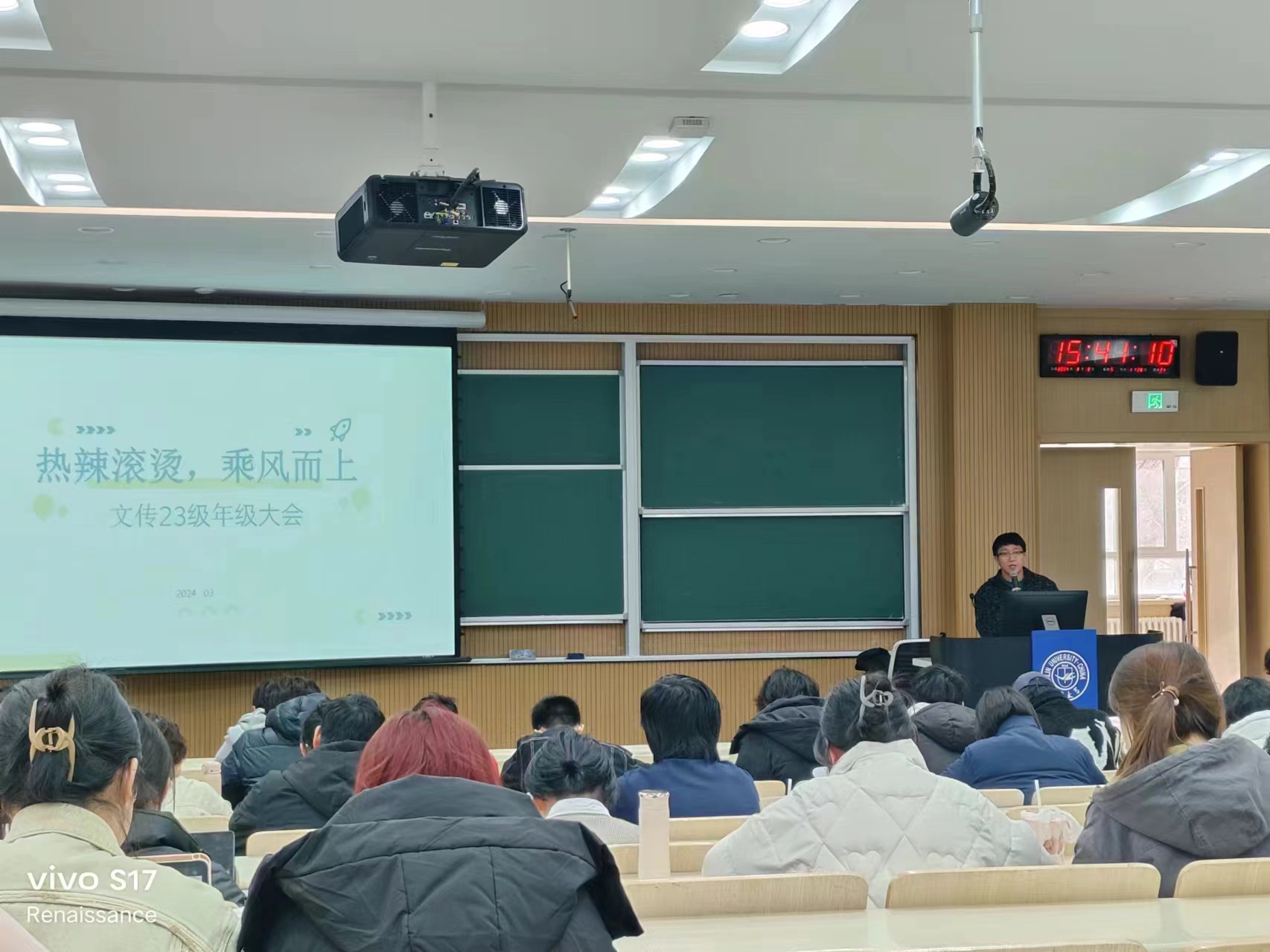 2023级年级大会暨就业指导课线下课在逸夫七阶召开,主题为热辣滚烫,乘风而上。围绕新学期生活、学习等方面的问题进行同步,以及进行就业方向和如何明确生涯规划的前景指导。由极速飞艇