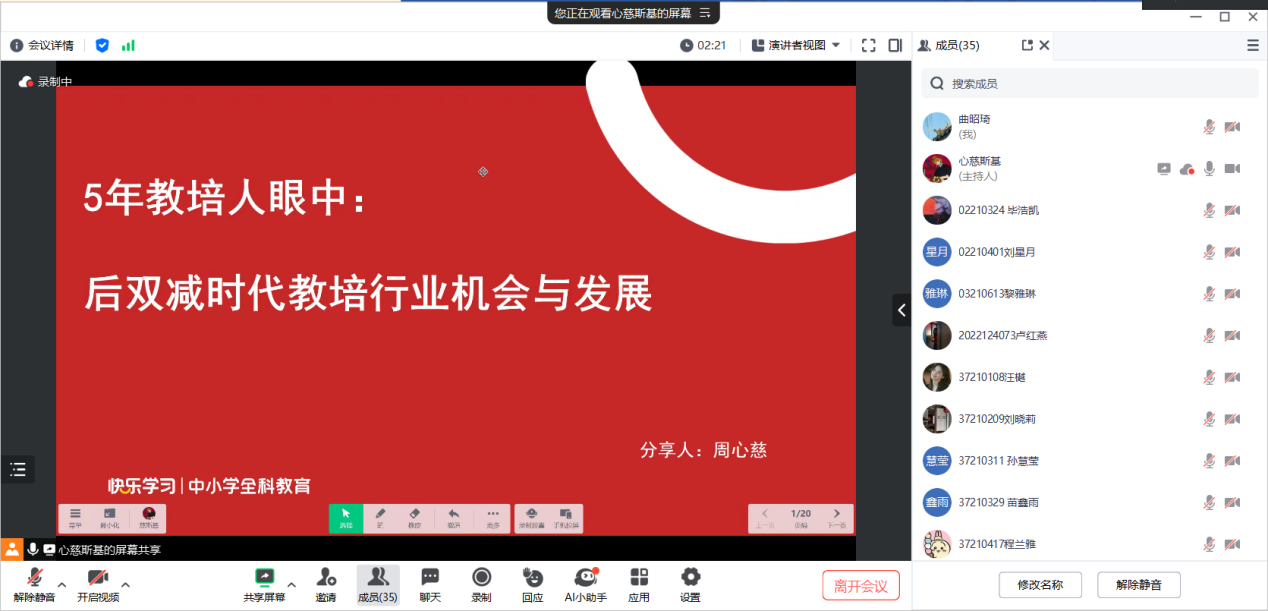 优秀校友周心慈担任主讲嘉宾,为同学们了解教培机构以及求职、校招等问题提供了宝贵机会,2020级辅导员李芊满参会,兼职辅导员曲昭琦主持会议。