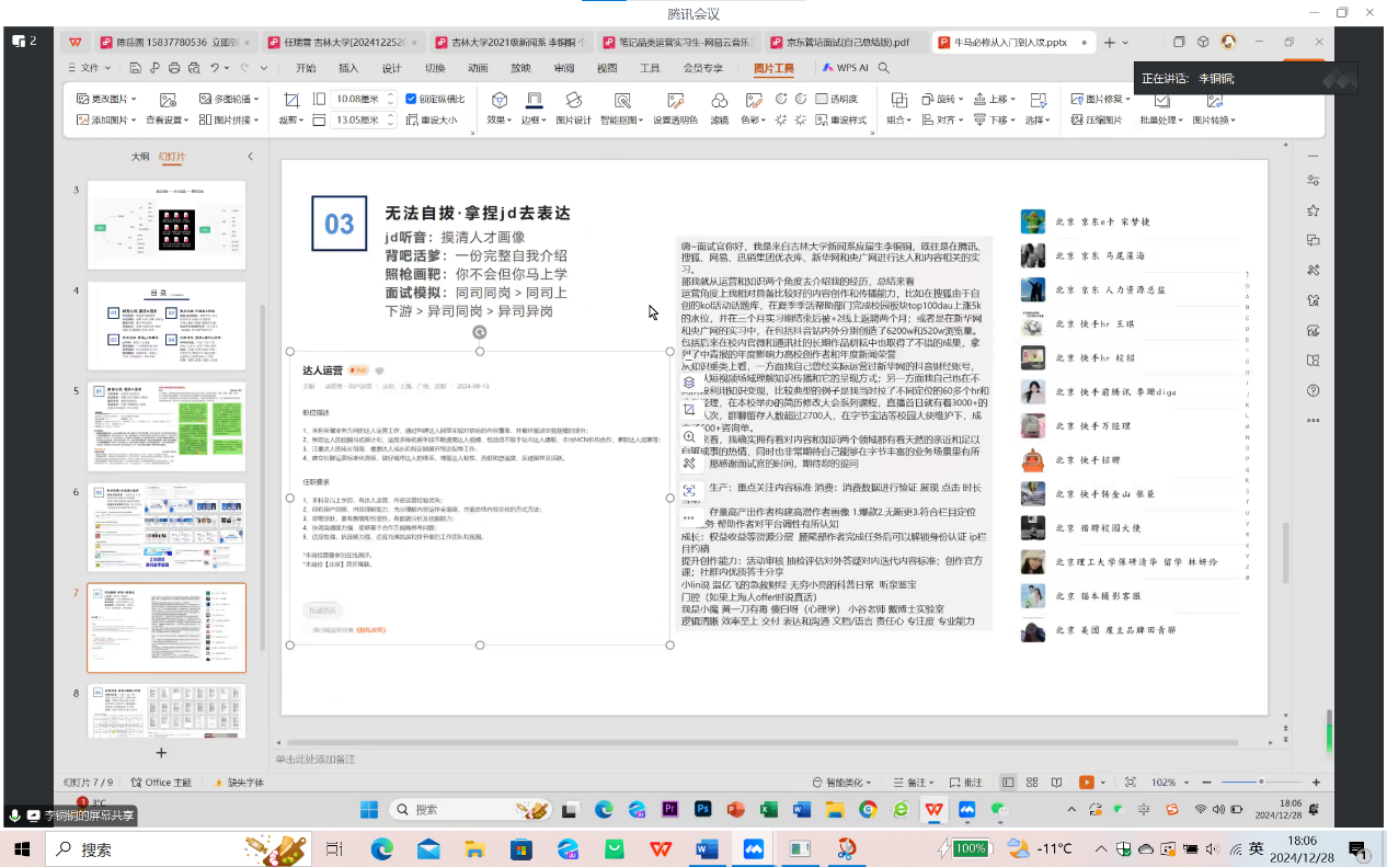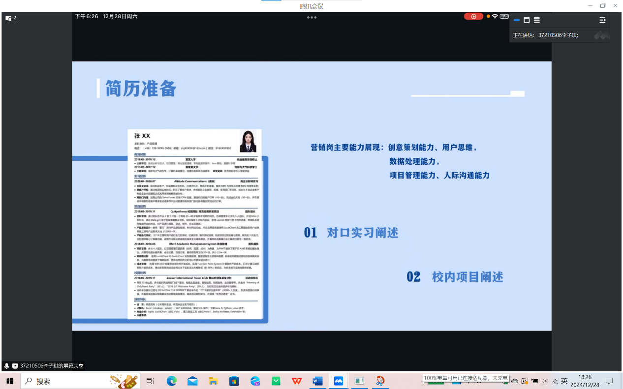 新闻学专业李铜铜同学凭借丰富的实习经历,成功获得互联网公司的青睐。李铜铜分享了简历书写的两大原则:一是说明性与垂直性的结合,二是叙述时应遵循背景、职责、成果、关键词的顺序,建议同学们在实习经历不多的情况下,选择一些短期高产的实习机会,如校官媒,线上实习等,也可以联系求职指导的老师进行规划,并向同学们推荐了一些面试经验获取的平台,如小红书、牛客、脉脉等,并分享了自己的面试准备技巧。