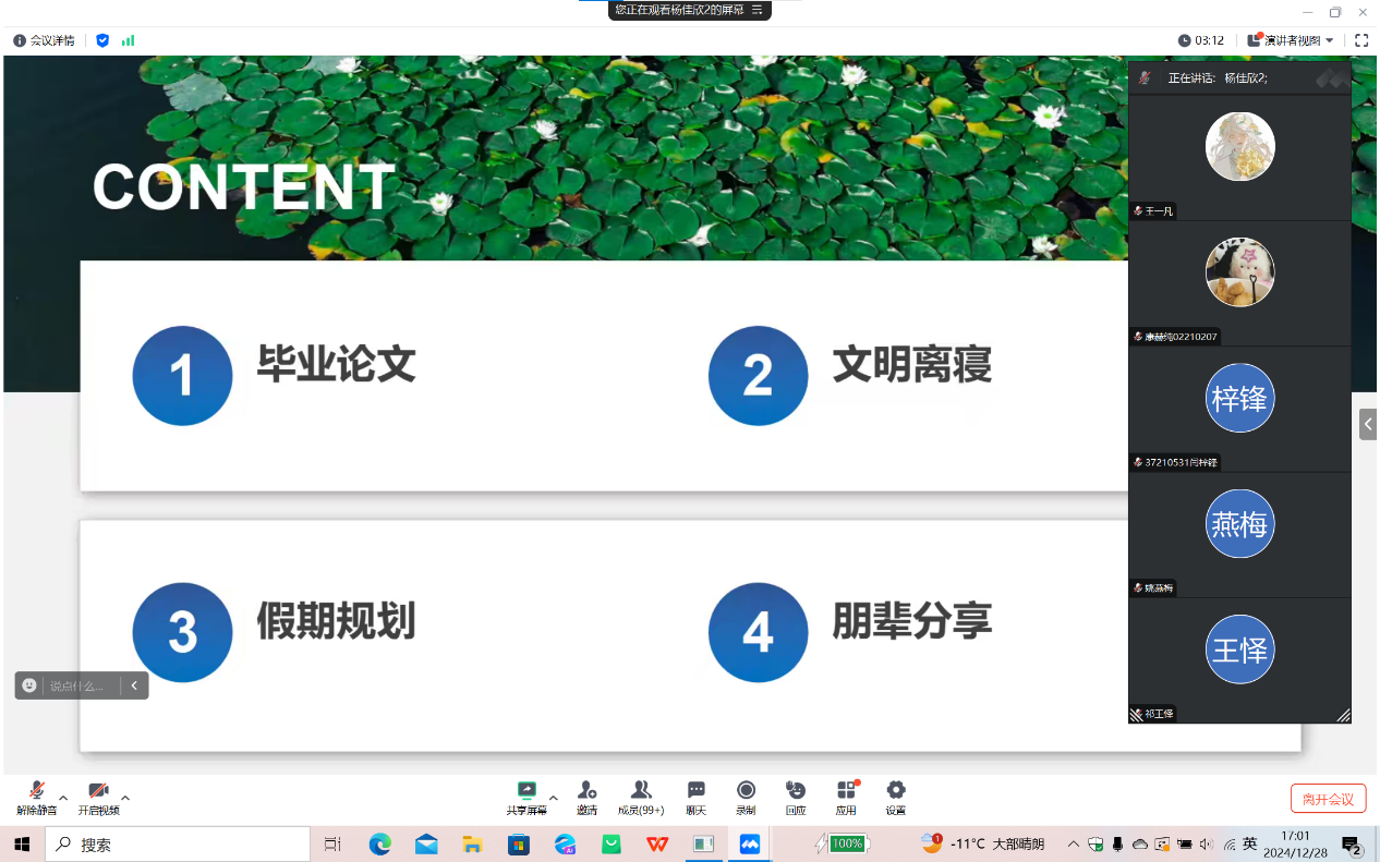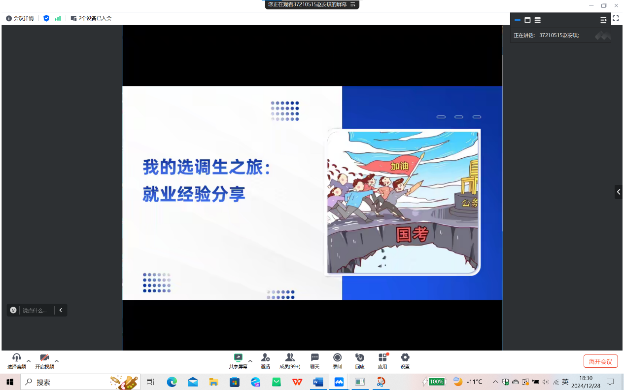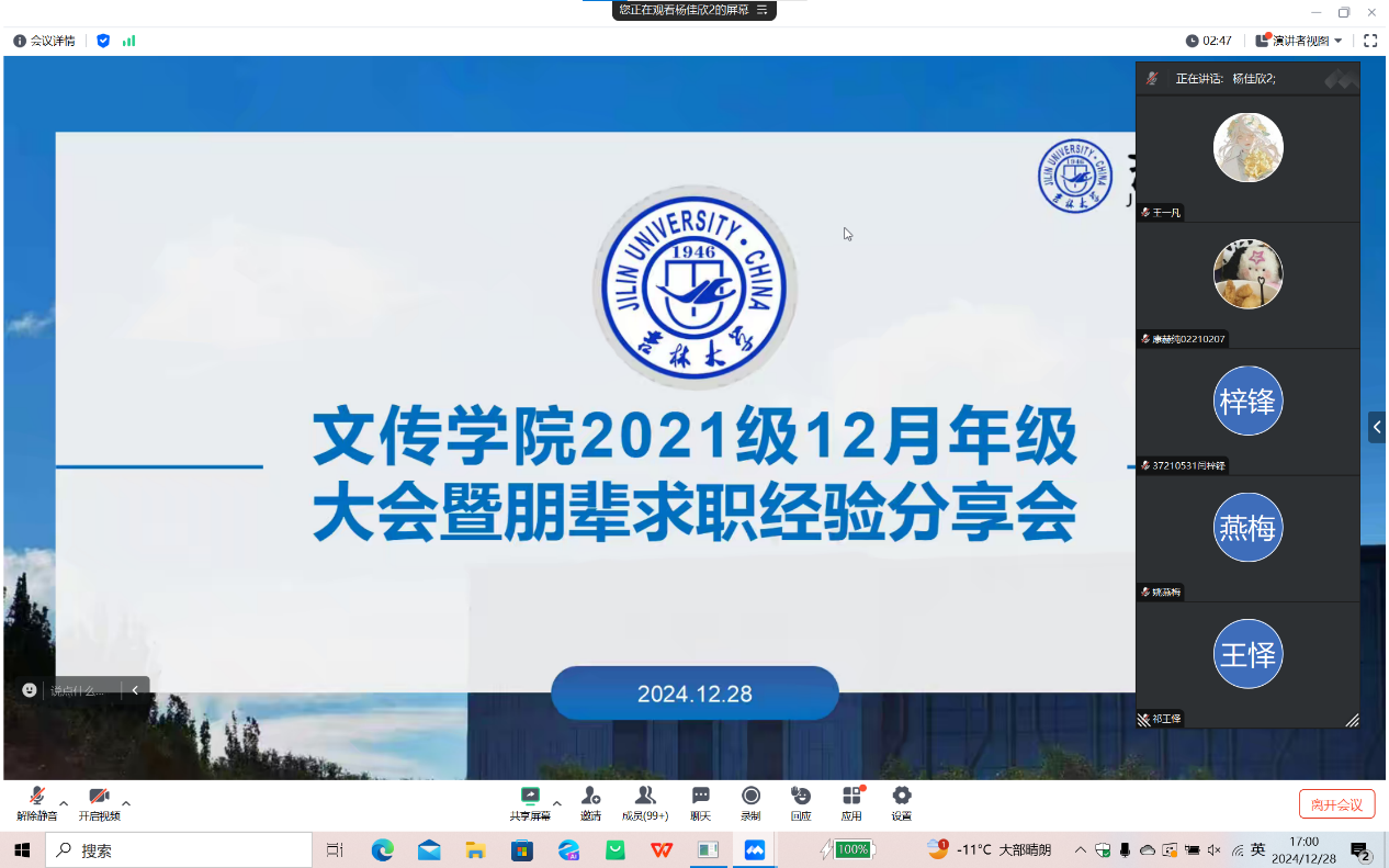 在寒假前夕以线上形式召开了年级大会暨朋辈就业经验分享会,会议由辅导员杨佳欣老师主持,全体大四学生参加了此次大会。会议内容涵盖了毕业论文、文明离校、假期规划以及求职经验分享四个方面,为同学们即将到来的寒假生活和未来职业规划提供了宝贵的指导和建议。