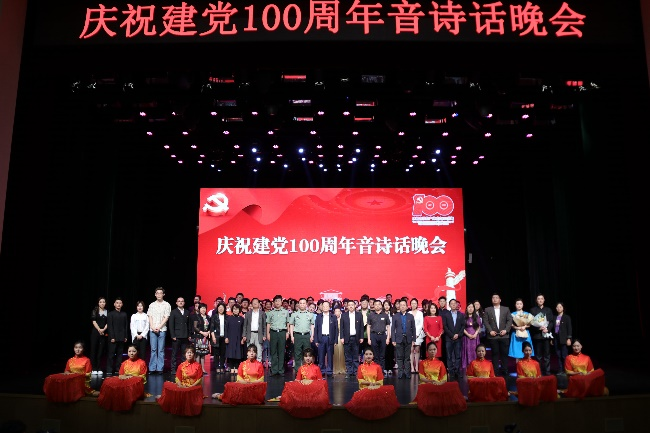 表彰大会后,师生共同观看了庆祝建党100周年音诗话晚会,本次晚会设计巧妙,采用倒叙方式将我党发展变革的百载岁月划分为建功立业新时代、改革开放换新篇、开天辟地新中国、燎原之火燃东方以及尾章五个篇章,17个节目融合音乐、舞蹈、诗歌、话剧、配音、朗诵等多种形式,。晚会现场掌声如潮,有温情、有热泪,讴歌了百年辉煌党史,突出表达着共贺党诞百年的主题