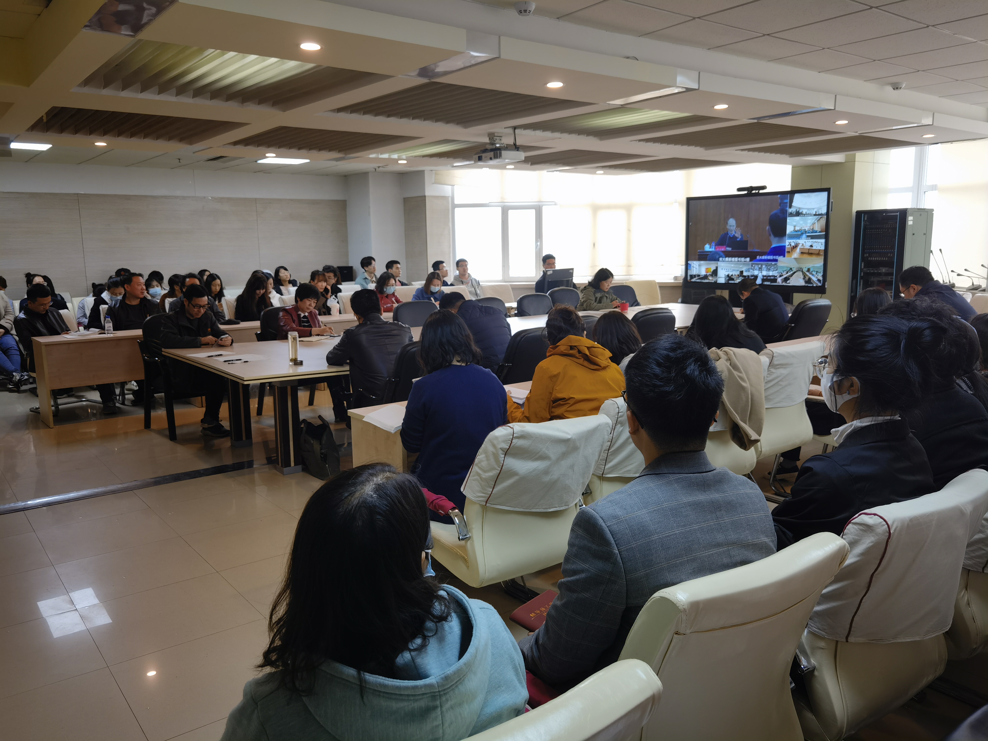 全体处级领导干部、党委委员、纪委委员、各系教工党员、学生党员代表于东荣十楼会议室在线观看视频直播,进行学习。
