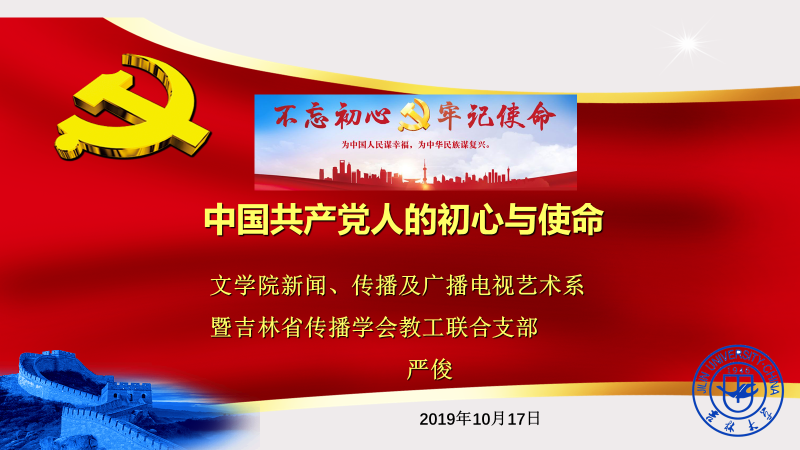 新闻、传播及广播电视艺术系暨吉林省传播学会教工联合支部在东荣大厦11楼会议室召开全体党员大会,支部书记严俊教授对支部“不忘初心、牢记使命”主题教育工作进行了动员部署,并给支部党员上了一堂《中国共产党人的初心与使命》的专题党课。