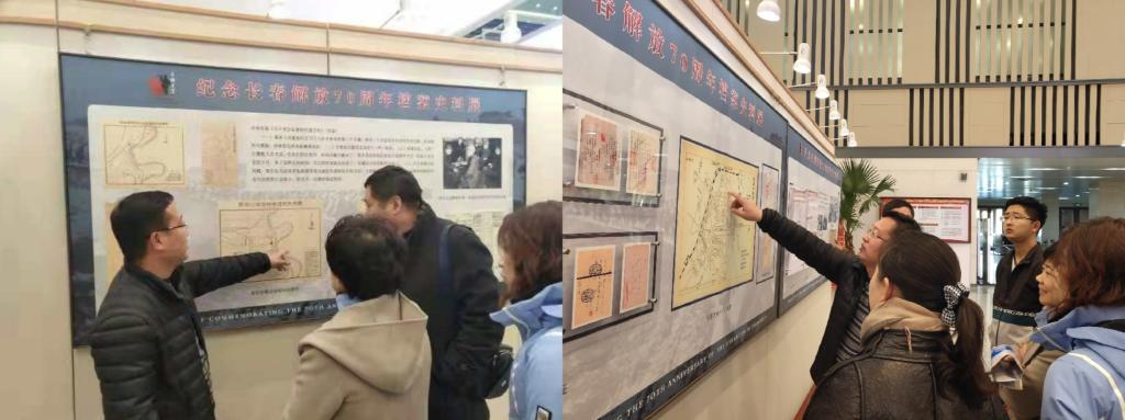 展览共分为决战序曲、兵临城下、久困长围、特殊战役、和平解放、人庆更生六个部分。展览不仅以图文并茂的形式展出大量珍贵详实的档案史料,同时还展出如毛主席为辽沈战役取得伟大胜利题词、第二、三次围城图、国民党守军使用的通行证、伪造的解放区路条、解放区使用的通行证、国民党政府查封粮食的封条、瓦解守军的宣传单等珍贵的档案仿制品,真实还原了英勇的解放军战士和英雄的长春人民为长春解放做出的巨大牺牲。师生党员们伫立在一幅幅图片之前,认真观察,仿佛置身于70年前的战火纷飞之中。师生党员们还纷纷谈起自己的祖辈、父辈们为解放战争做出的贡献,无不感慨现在的幸福生活来之不易。毛泽东主席“人民的胜利”的题词雄伟壮阔,充满气魄,让师生党员们啧啧称赞,驻足留念。
