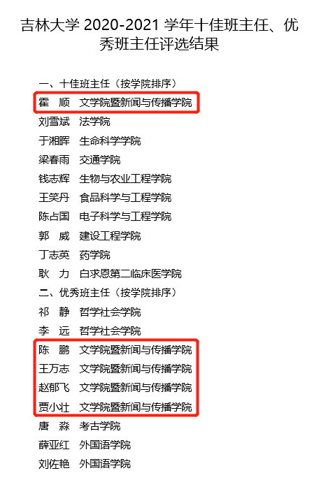 2020-2021学年十佳班主任、优秀班主任”荣誉称号。其中,霍顺老师荣获“十佳班主任”称号,陈鹏、王万志、赵郁飞、贾小壮老师荣获“优秀班主任”称号。