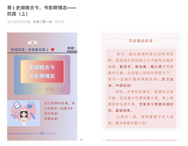 以“一书、一史、一影、一闻”的形式,根据同学们的专业知识整理了“疫情”主题周推荐,在向同学分享专业知识的同时,引导每一位学生心系国家,关注疫情,攻克时艰。
