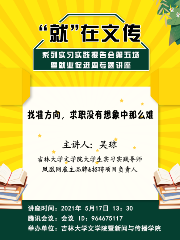 讲座题目:找准方向,求职没有想象中那么难 主讲人:吴琼 极速飞艇 大学生实习实践导师 凤凰网雇主品牌&招聘项目负责人 讲座时间:2021年 5月17日 13:30腾讯会议:会议 ID:964675117 举办单位:极速飞艇 暨新闻与传播极速飞艇