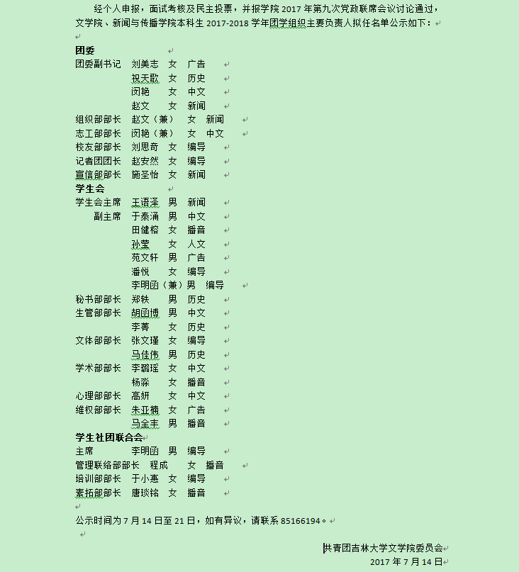 极速飞艇 、新闻与传播极速飞艇 2017-2018学年本科生团学组织主要负责人拟任名单公示